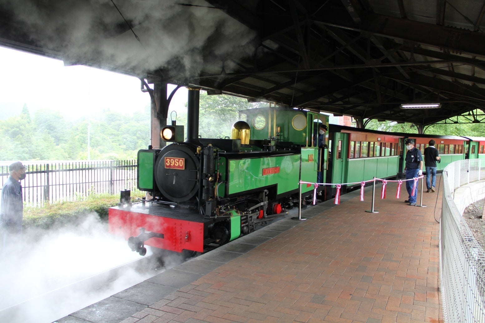 7/4(日)にSLあぷとくんの出発式が行われました。皆様のご協力により、ついに営業運転を再開することができました。深く感謝申し上げます。当日は雨が降る中でしたが、多くのお客様にご来園いただきご乗車いただきました。