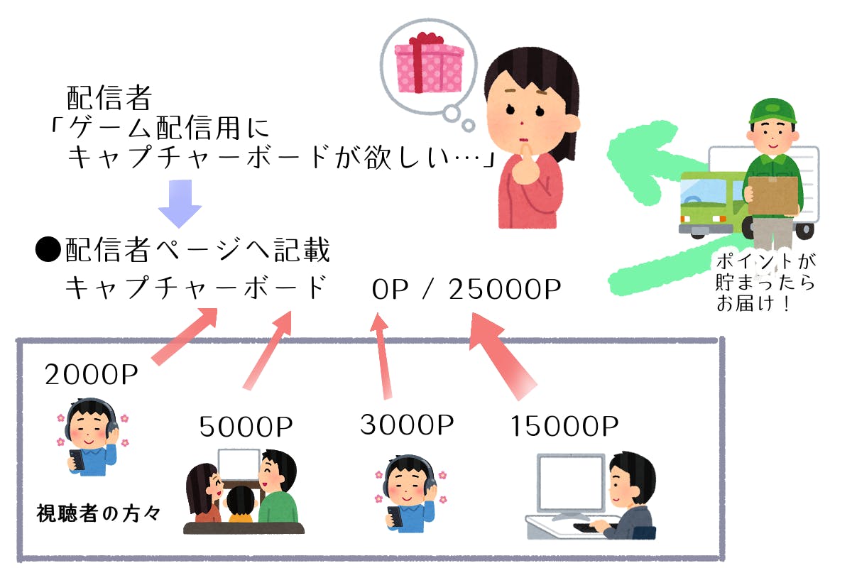 ●視聴者は配信者にポイントをそのまま寄付することができ、配信者はそのポイントを使い運営に物品の代理購入を依頼することもできる。