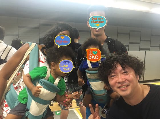 渋谷駅で写真撮らせてもらったもじゃもじゃ頭の子供たちとそのご両親(一般の方なのでモザイクで)