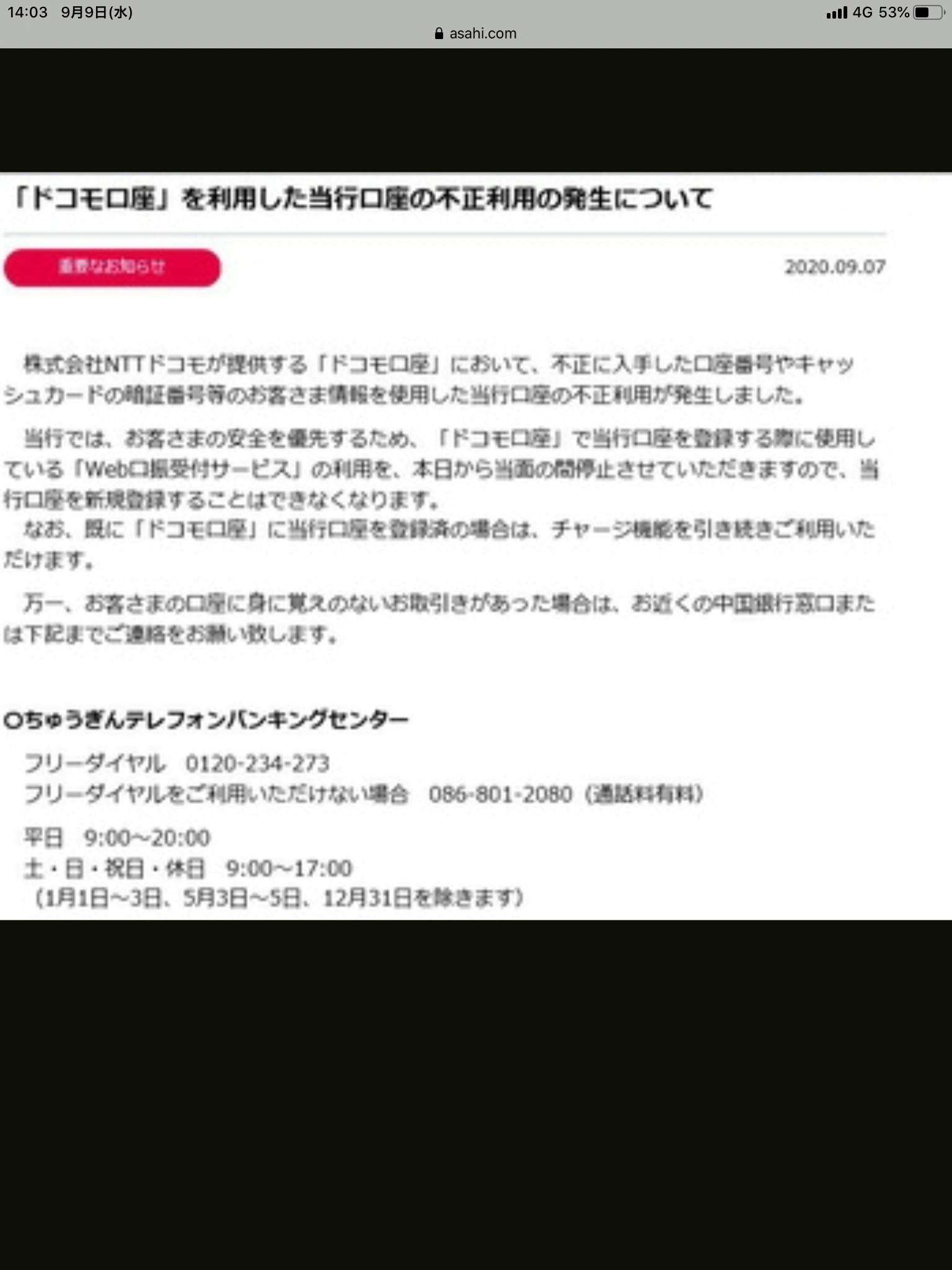 NTTドコモの電子決済サービス「ドコモ口座」を使った預金の不正引き出しが相次いでいる問題で、ゆうちょ銀行は9日、同行の口座とドコモ口座との新たな連携を中断したと発表した。同行は「身に覚えのない取引があった場合は、連絡を」と呼びかけている。