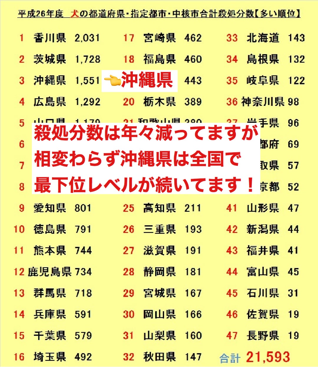 沖縄は観光で有名で毎年のように海外からくる観光客も増加し、人気は衰えません。その裏で実は県外より物価が高い!家賃が高い!土地や家が高い!ってのはあまり知られていません。それなのに賃金は全国最下位レベルなため共働きでないと生活できない人の割合がかなら多いです。そして野良犬野良猫の殺処分数も年々減ってきては居ますが毎年全国ワーストランキング入りしている現状があります。