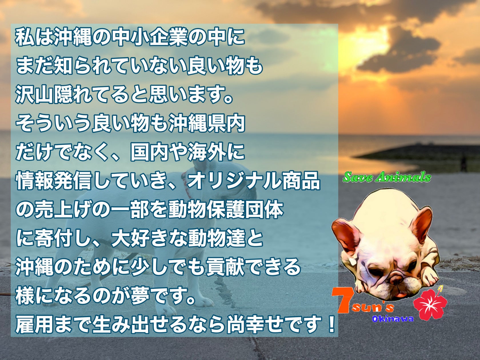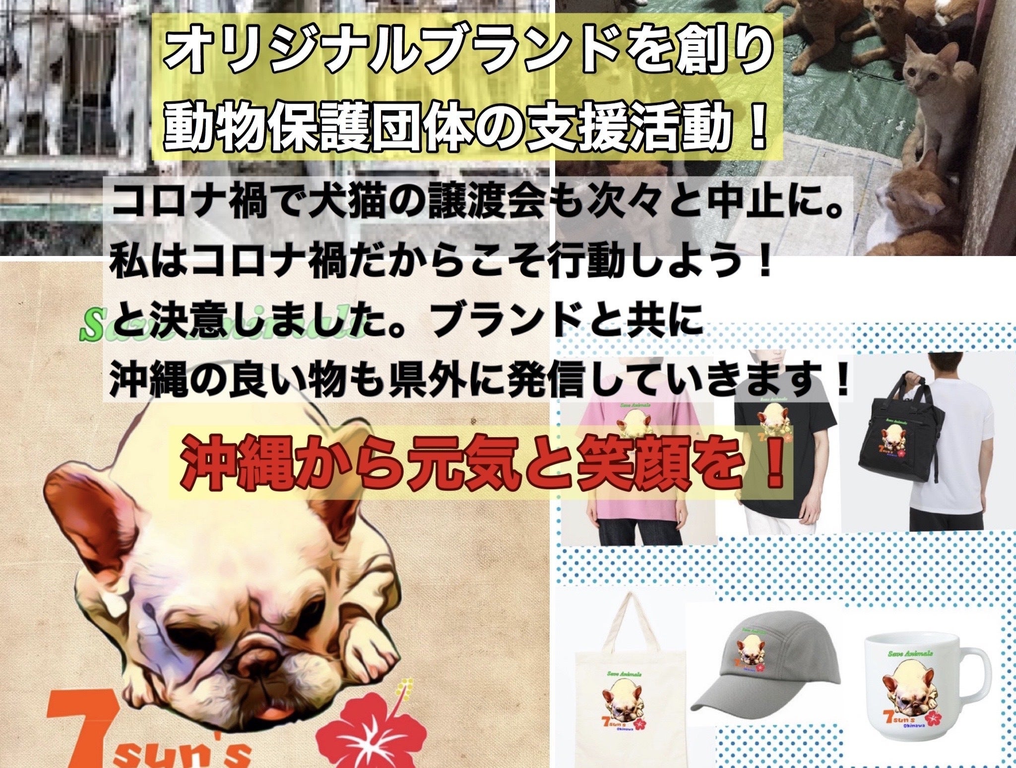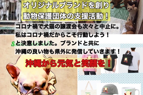 新型コロナが流行し、思ってもいなかった世界になってしまいました。そんな中でも野良犬野良猫の殺処分は変わりません。保護団体さんの譲渡会も続々と中止になってしまってます。そこで私はオリジナルのブランドを立上げネット販売、実店舗販売をしその売上の一部で保護団体様を支援し協力する仕組みを創りたいと思ってます。沖縄にも実は県民にもまだ知られてない良い商品が沢山眠ってるはずです。それらも沖縄から国内へ!そして世界へ沖縄の良さと元気を届けていきたいと思ってます。