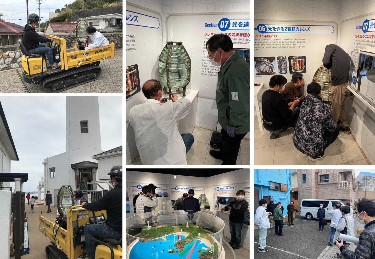 現在、野間灯台の灯機はLEDです。2008(平成20)年までは白熱電球でした。そして、電球の光を遠くまで届けるためにフレネルレンズが使われていました。2008年に役目を終えた野間灯台のフレネルレンズは、今日まで大王埼灯台の資料館に展示されていました。 本日、 ついにそのフレネルレンズの里帰りが実現しました。美浜町産業課の三枝課長と蟹江係長とともに大王埼まで行き、昨年度、美浜町に寄贈していただいた名古屋港防波堤灯台のレンズと以前、野間灯台にあったレンズを交換してきました。 大王埼では志摩市灯台活用推進協議会のみなさん、海上保安庁の方々にご協力いただきました。ありがとうございました。 14年ぶりに里帰りを果たしたフレネルレンズ、準備が整い次第、食と健康の館にて展示をする予定です。