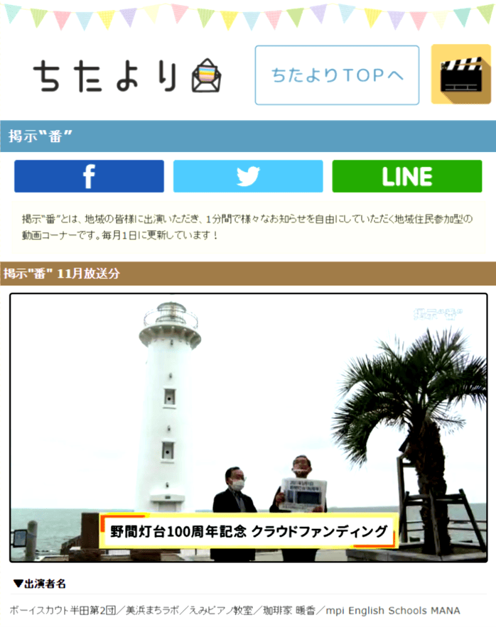 半田地区のケーブルテレビCACにて、1ヶ月間クラウドファンディングのお知らせを放送していただきます。「CACかわら“番”」と「掲示“番”」という番組内で放送されます。なお、この動画はネットでも配信されています。以下のページにアクセスすると、いつでもご覧いただけます。http://cac-net.jp/keijiban/