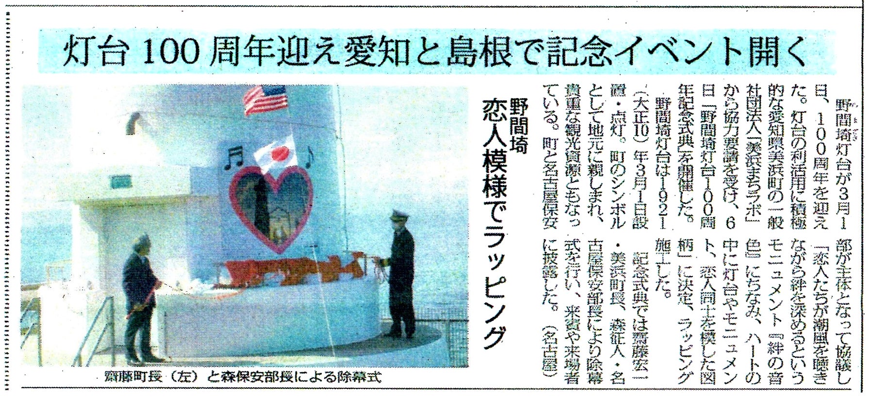 3月の100周年記念式典の模様が海上保安新聞にて紹介されました。3月の記念式典は、コロナ禍のため規模を縮小して行われました。クラウドファンディングに出資していただいた皆様のご期待に添うようなイベントが実施できなかったこと、お詫び申し上げます。新たなイベントの企画を模索しておりますが、5月12日より愛知県にも緊急事態宣言が発出され、現状では見通しが立ちません。状況が変わりしたいこちらの活動報告等でお知らせしていきますので、しばらくお待ちください。なお、ウェブカメラの設置、野間灯台の様子のライブ配信については準備を進めております。こちらも完了いたしましたら、またご報告をさせていただきます。