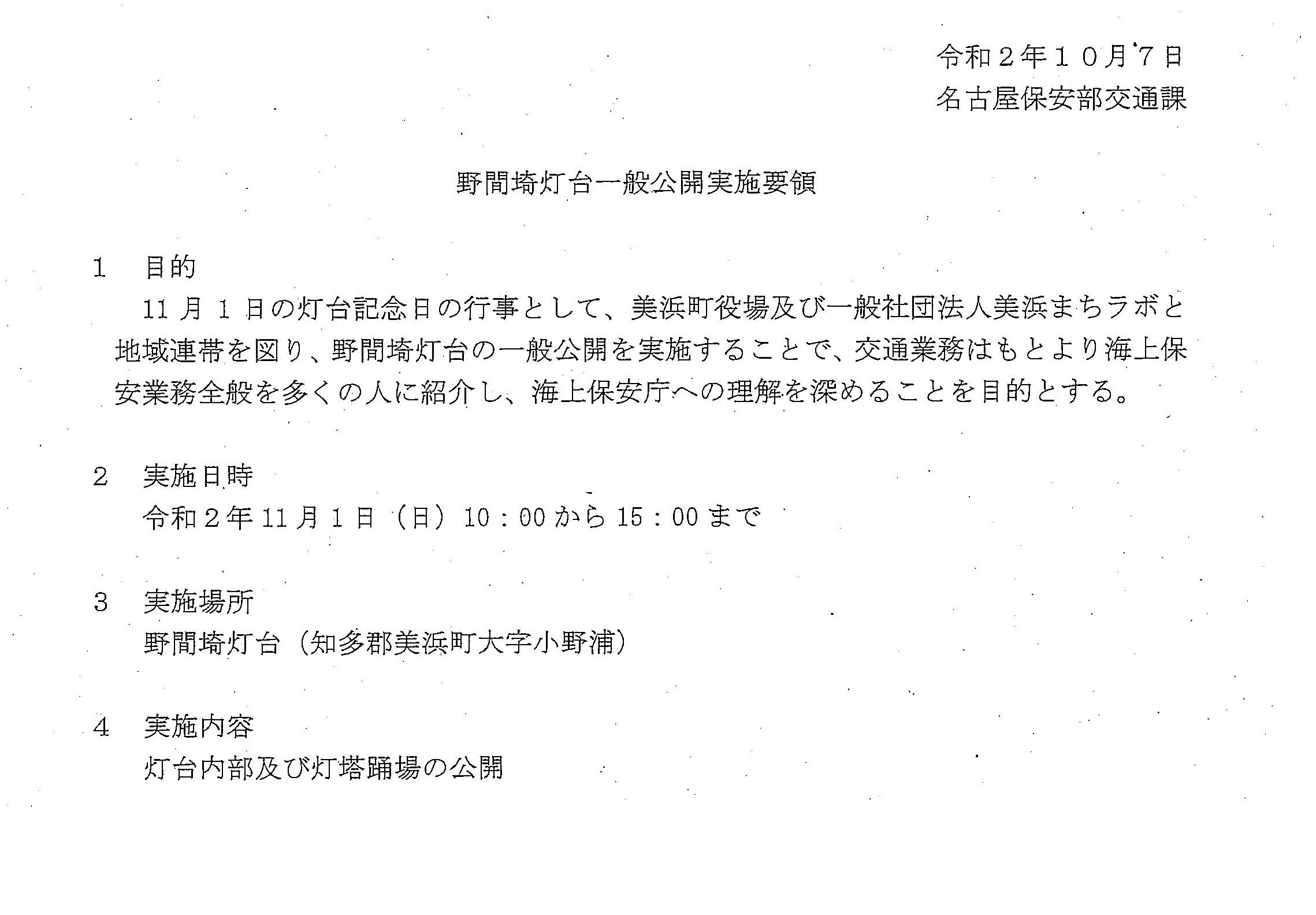 名古屋海上保安部と美浜町によって、11月1日(日)に野間埼灯台が一般公開されます。感染症対策をしっかりとした上で、一度に登れる人数を5名までと制限をして実施されます。多くの人が登れるわけではないのですが、お時間がある方はぜひ野間灯台へお越しください。