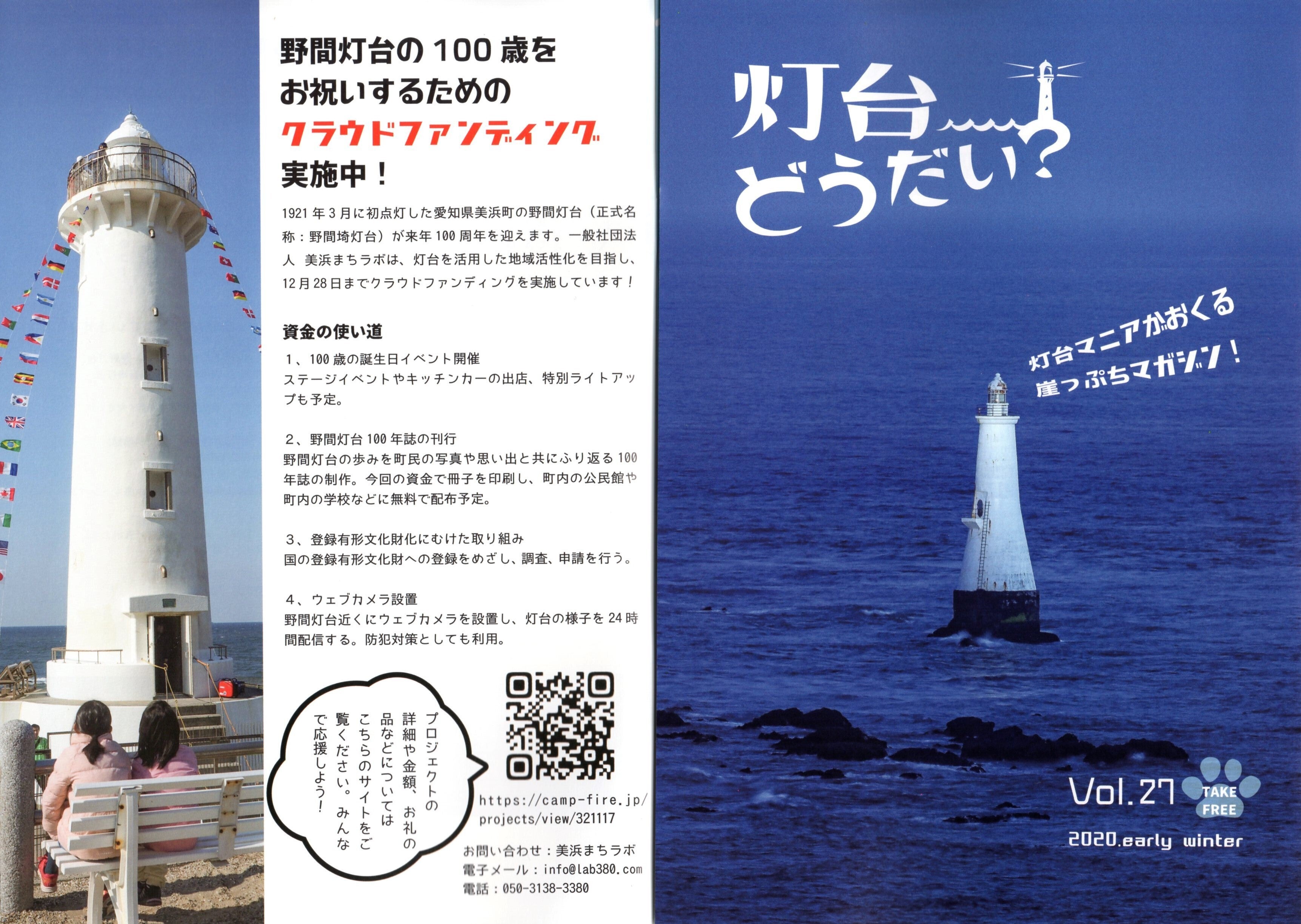 「灯台どうだい?」 は以前、野間灯台にも来ていただいた「灯台女子」の不動まゆうさんが編集するフリーペーパーです。11月1日発行の27号にクラウドファンディングの記事を掲載していただきました。「灯台どうだい?」は全国の登れる灯台や海事系の博物館、カフェやショップに置かれています。この辺りだと野間灯台前のカフェNOANOAさん、名古屋海洋博物館(名古屋港ガーデン埠頭)で手に入れることができます。「灯台どうだい?」のホームページは以下です。https://toudaifreepaper.jimdofree.com