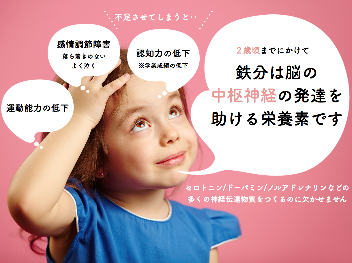 あまり知られていませんが、赤ちゃんにとって鉄は脳を育む大事な栄養素です。赤ちゃんの鉄欠乏は、長期的に発育・発達に悪影響を与えることが明らかになっています。