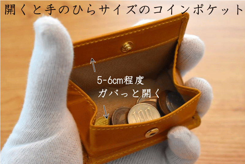 指先でなじむ【細く小さいフォルム】でも開くと大口のコインケースに。背面にはお札を折り畳んで収納できカードも1枚スマートに収納。(コイン最大20枚程度の収納推奨)