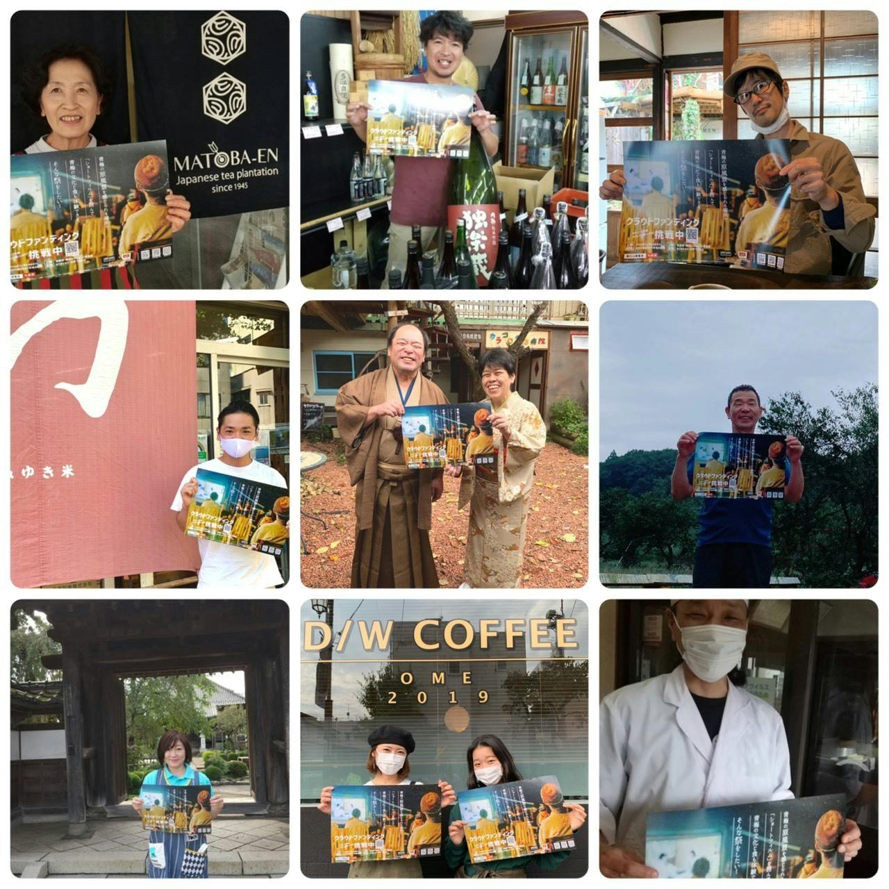 完成したCinema MADE IN OMEのポスターを手分けしてお願いして回っています。