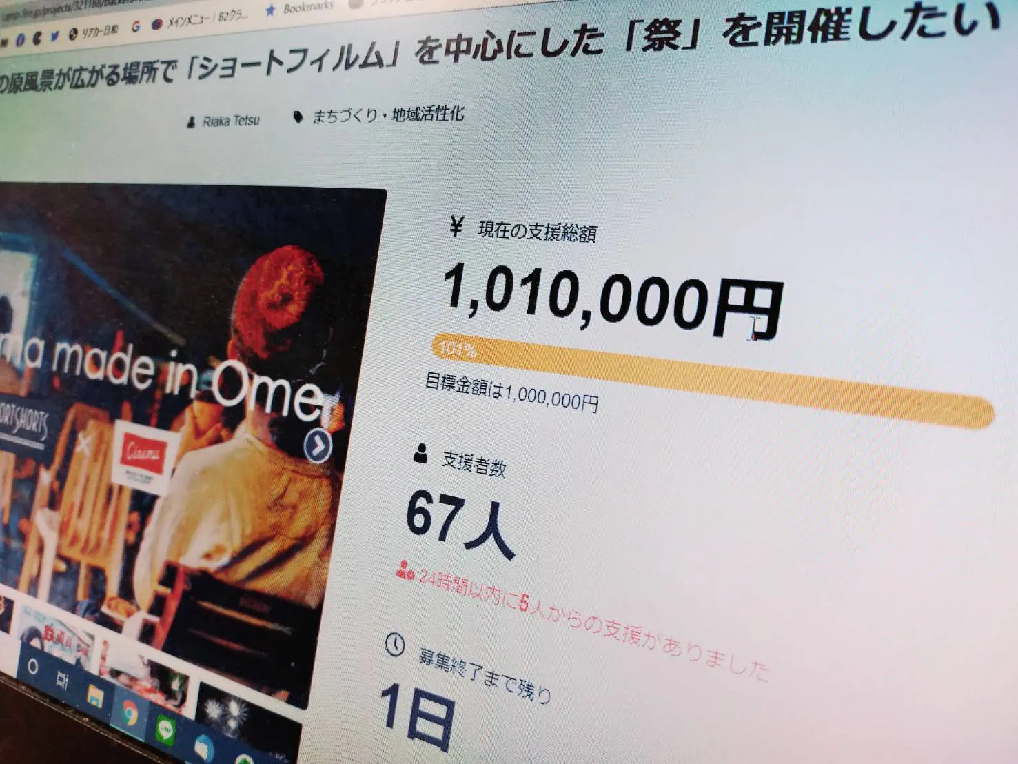 ただいま、CINEMA made in Omeのクラウドファンドが100万円の目標を達成しました!