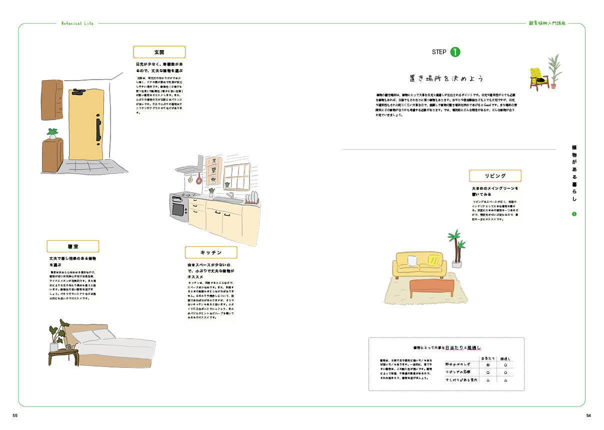 「(1)置き場所を決めよう、(2) 育てやすい植物を選ぼう 、(3) 植物の種類を知ろう、(4) 植物の細部を探ろう、(5) 鉢を選ぼう、(6)ガーデニング道具を知ろう、(7) 育て方とケア」の7ステップを元に、観葉植物の始め方について紹介しています。