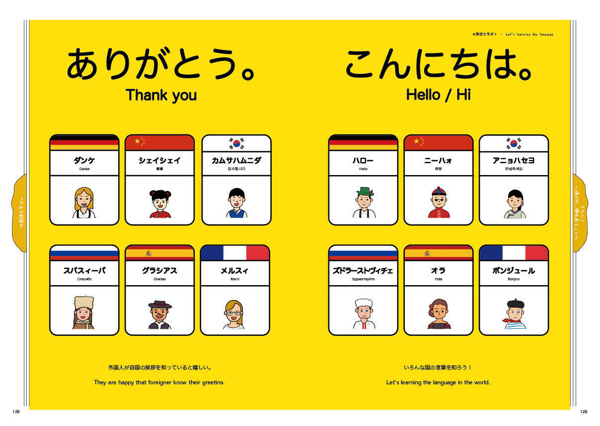 英語、韓国語、中国語、ドイツ語、フランス語、スペイン語、ロシア語の「こんにちは」と「ありがとう」をまとめました。