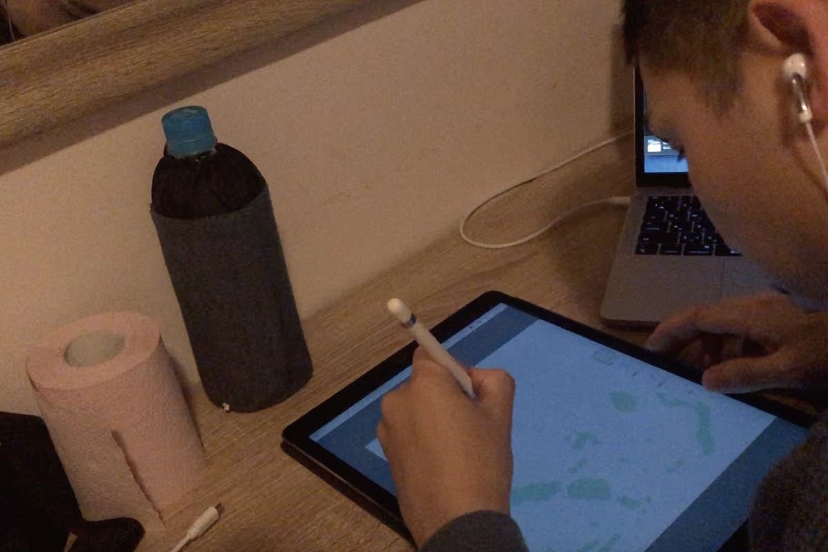 ↑3号目「エストニアへの一人旅」の制作で、深夜、エストニアのホステルにて地図イラストを描く