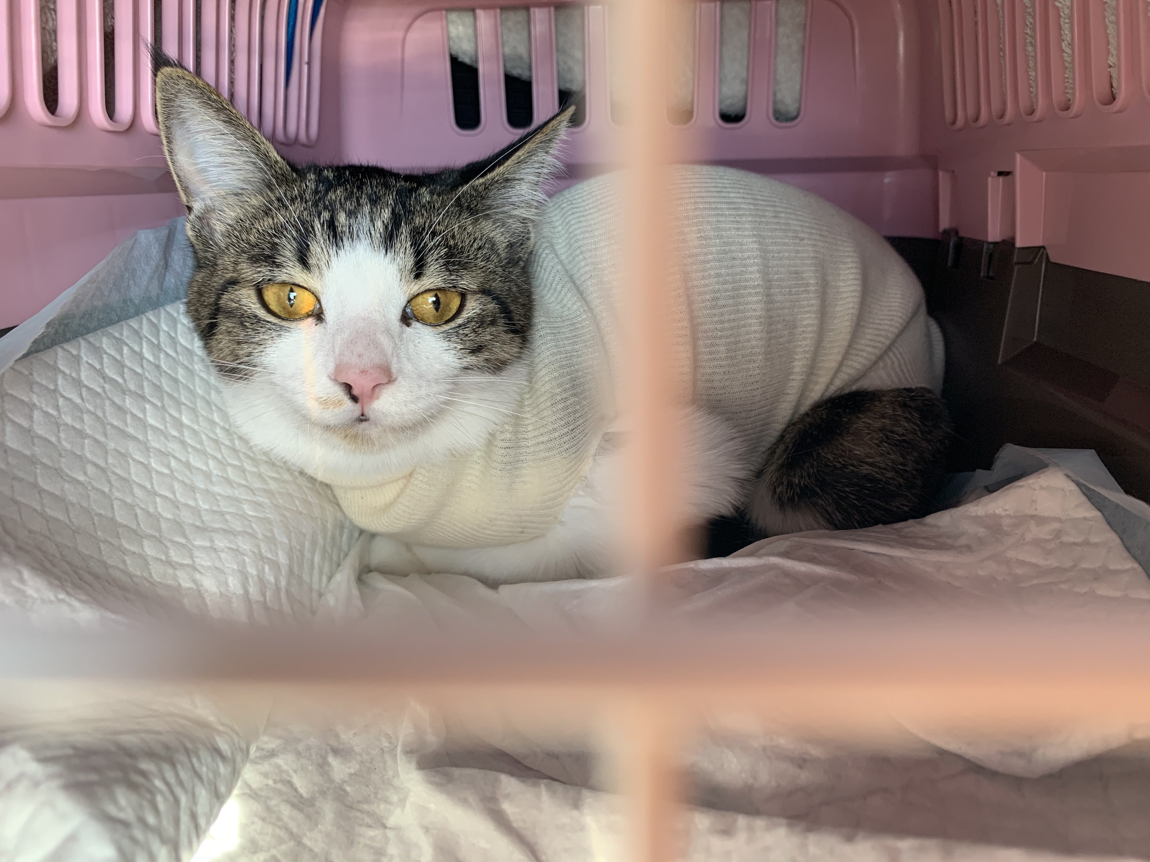 緊張してしまい、病院では一度も鳴かなかったらしいのですが、我々がお迎えに行って顔を見るやいなや「ニャー」と小さく鳴きました⭐︎