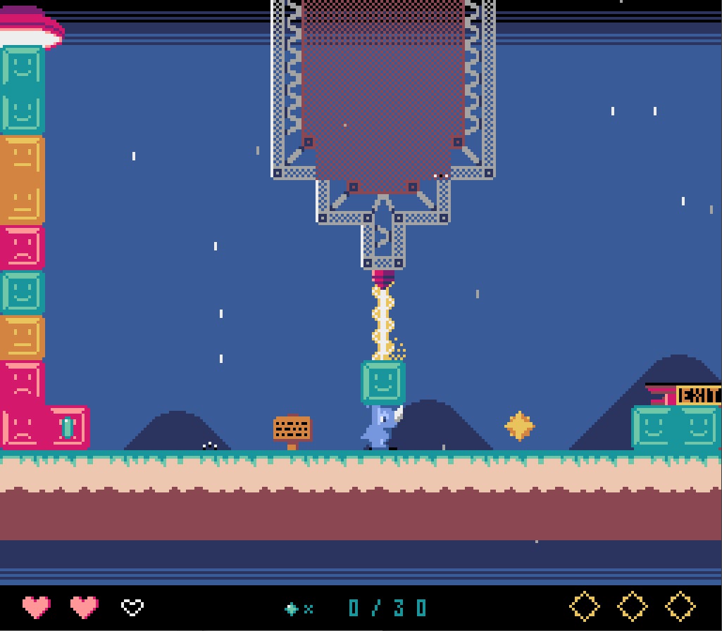 ゲームを遊んでいただく方が退屈しないように体験版にはないギミックを続々と追加しています!これは、ブロックを落として邪魔してくるUFO(敵?)。ブロックは邪魔にはなるけど攻撃手段や足場になるので時には嬉しい...?