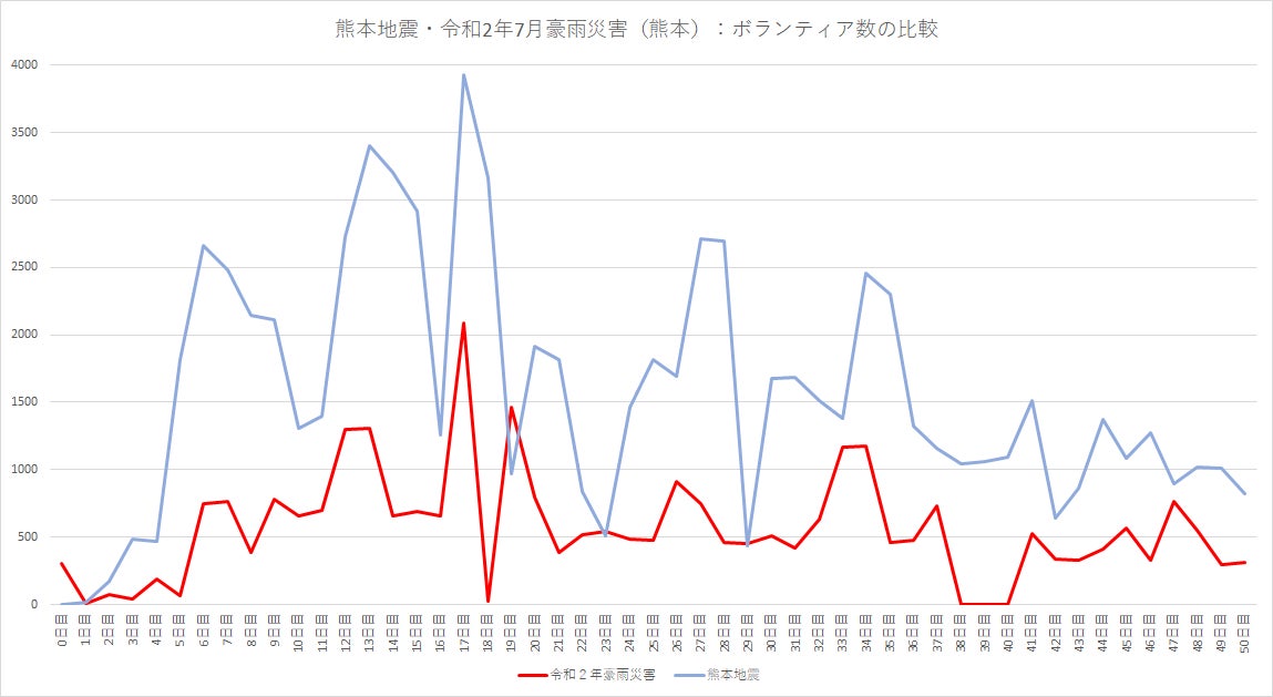 以下は4年前の熊本地震と令和2年7月豪雨災害のボランティア数を比較したグラフです。