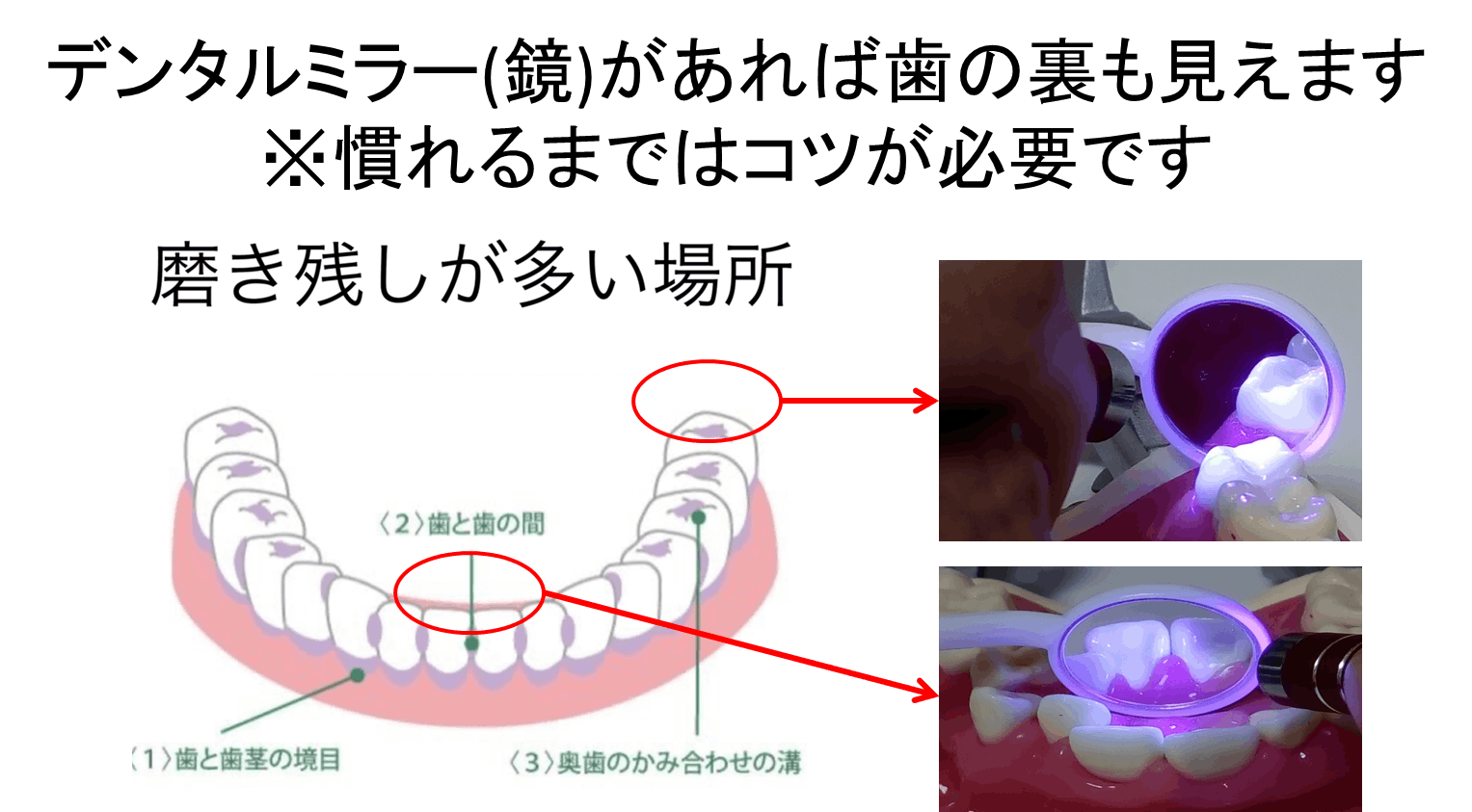 ※この製品は、お口の中の細菌に反応しますが、歯垢着色液で染まる歯の磨き残し(ペリクル)などを視覚化する機器ではなく、主に成熟したプラークを可視化する機器です。