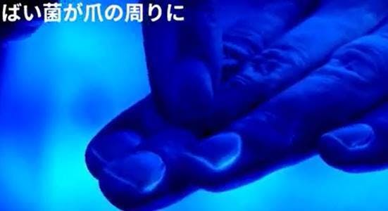 手洗いの洗い残しが多い箇所の眼に見えない異物が光って見えるため、手洗いにも応用するなどの応用もできます。