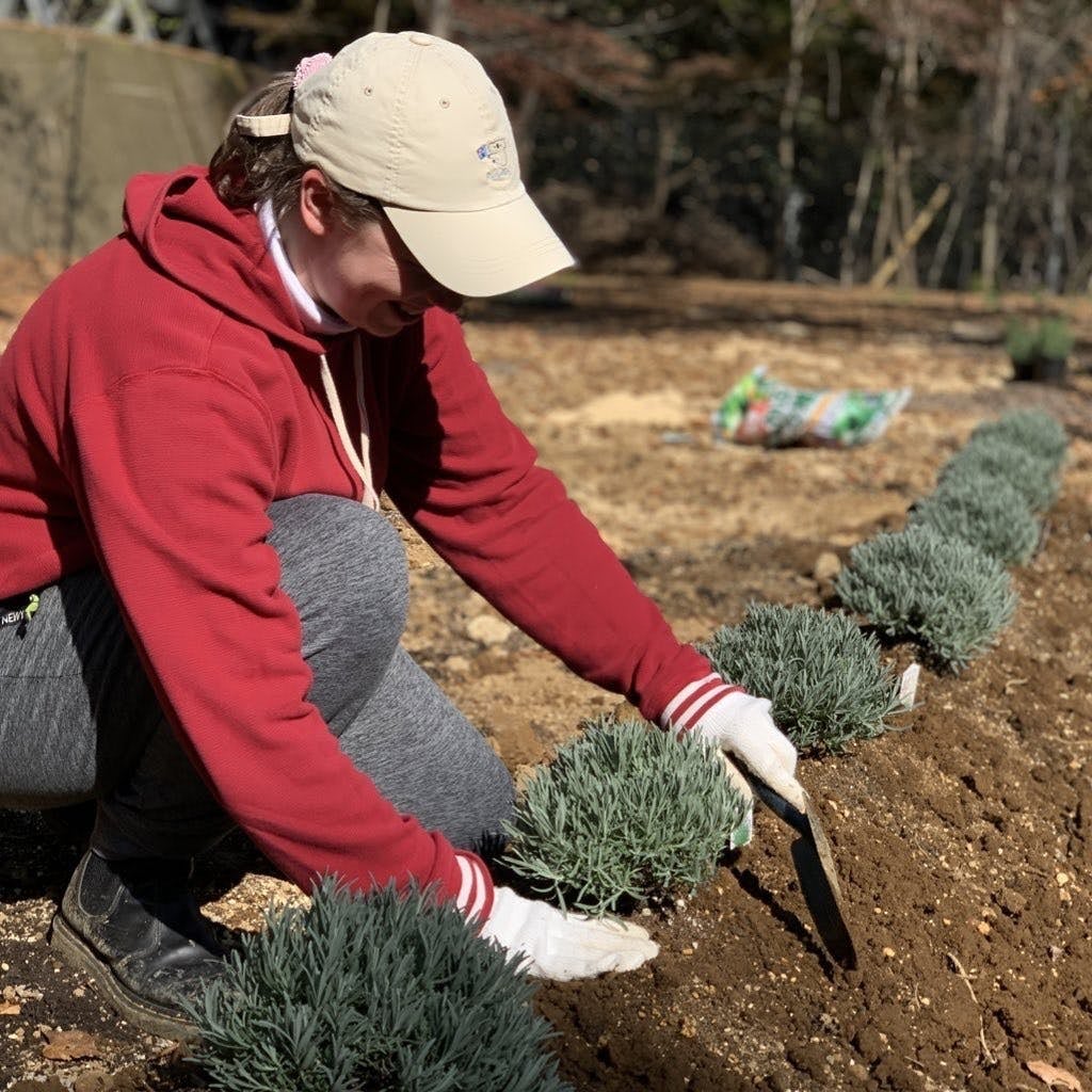 本日の作業は、醸造所裏にハーブ造園中でラベンダーを植えておりました。