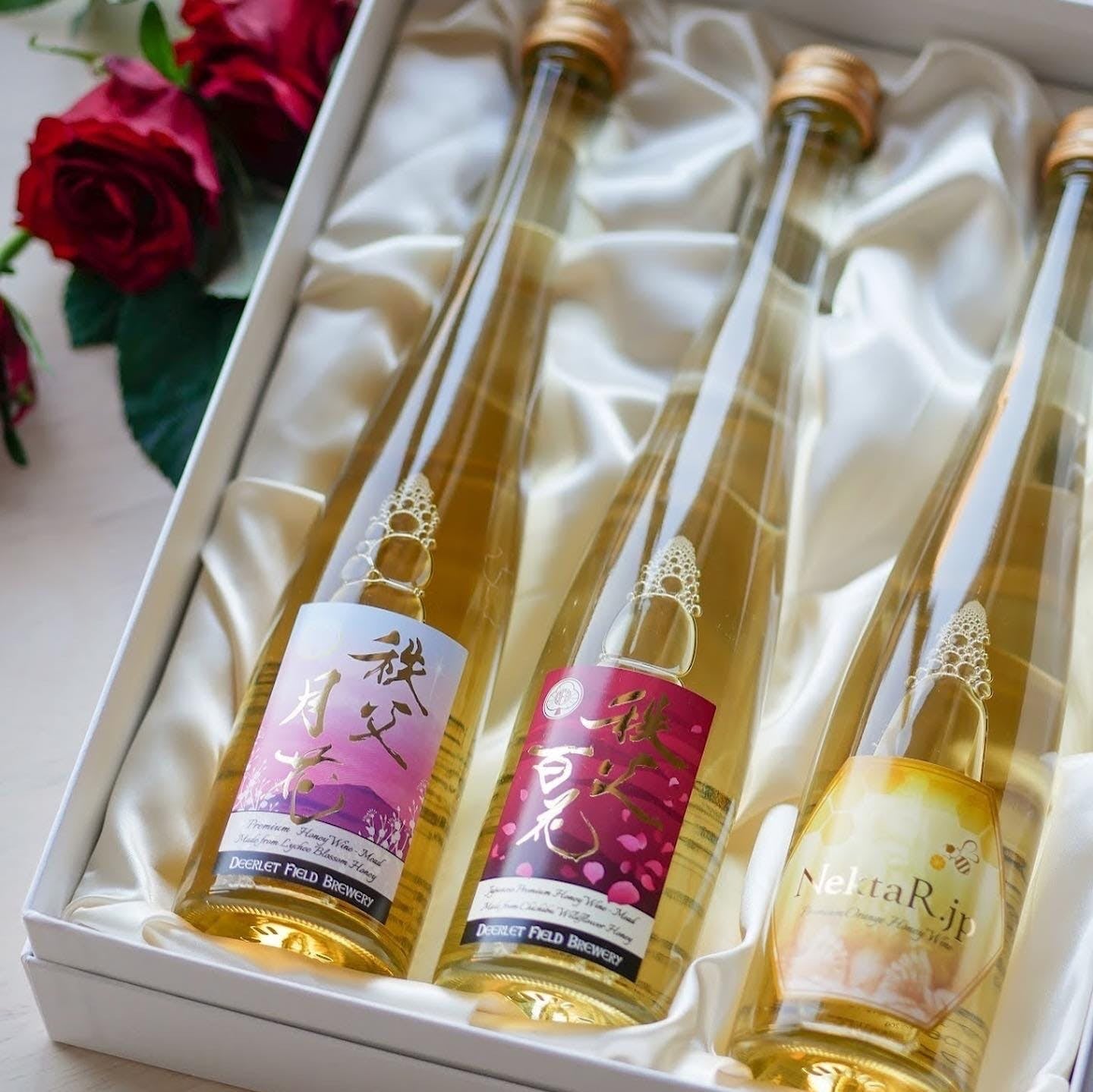化粧箱は本のページをめくるようにフタが開き、光沢のある白いサテンとともに黄金色の蜂蜜酒が華やかに登場します。