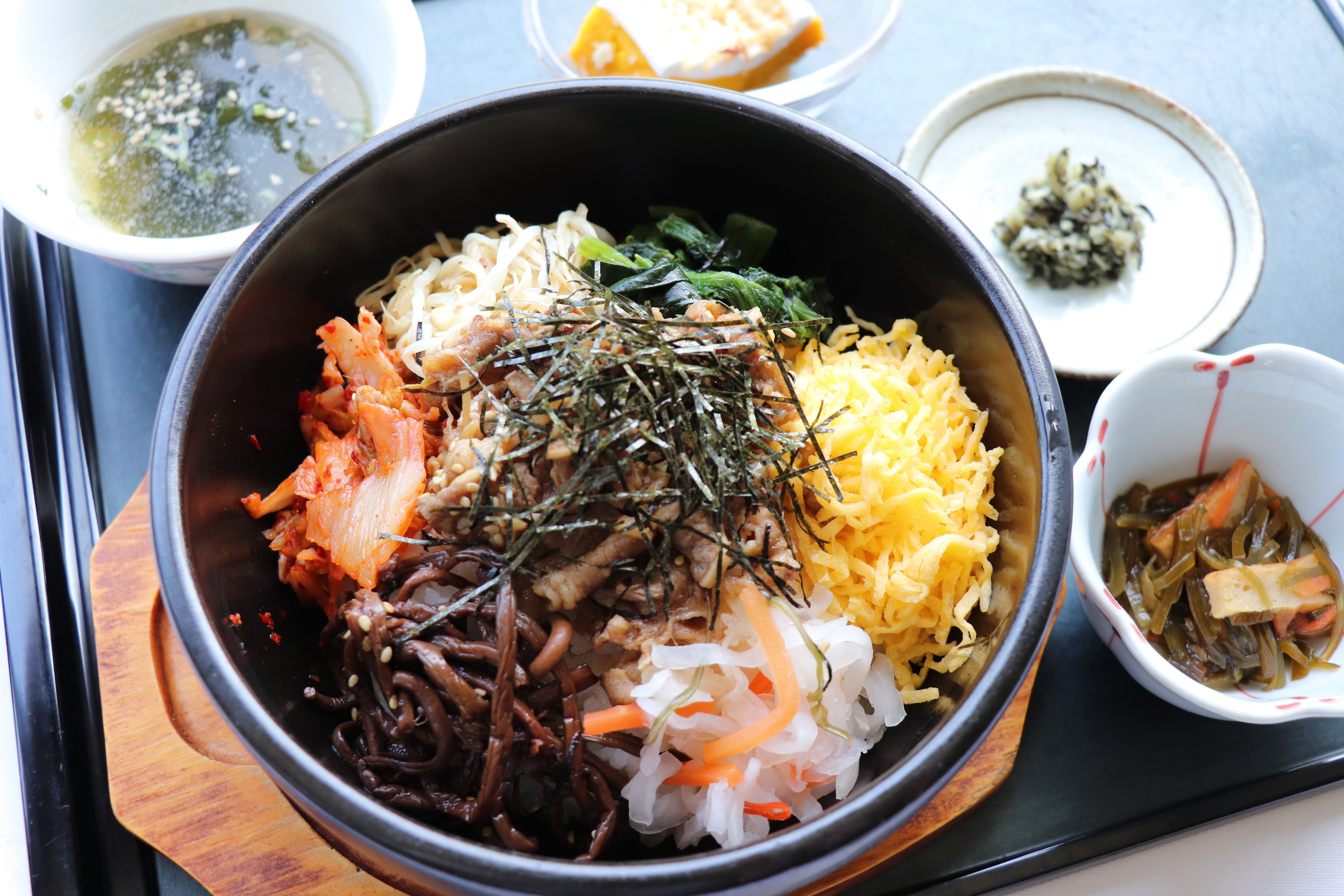 あつあつの鍋に焼肉、自家製ナムル、キムチ等をトッピングした、「西カン」おすすめメニューです。中華スープにデザートとボリュームの一品をぜひご賞味ください。