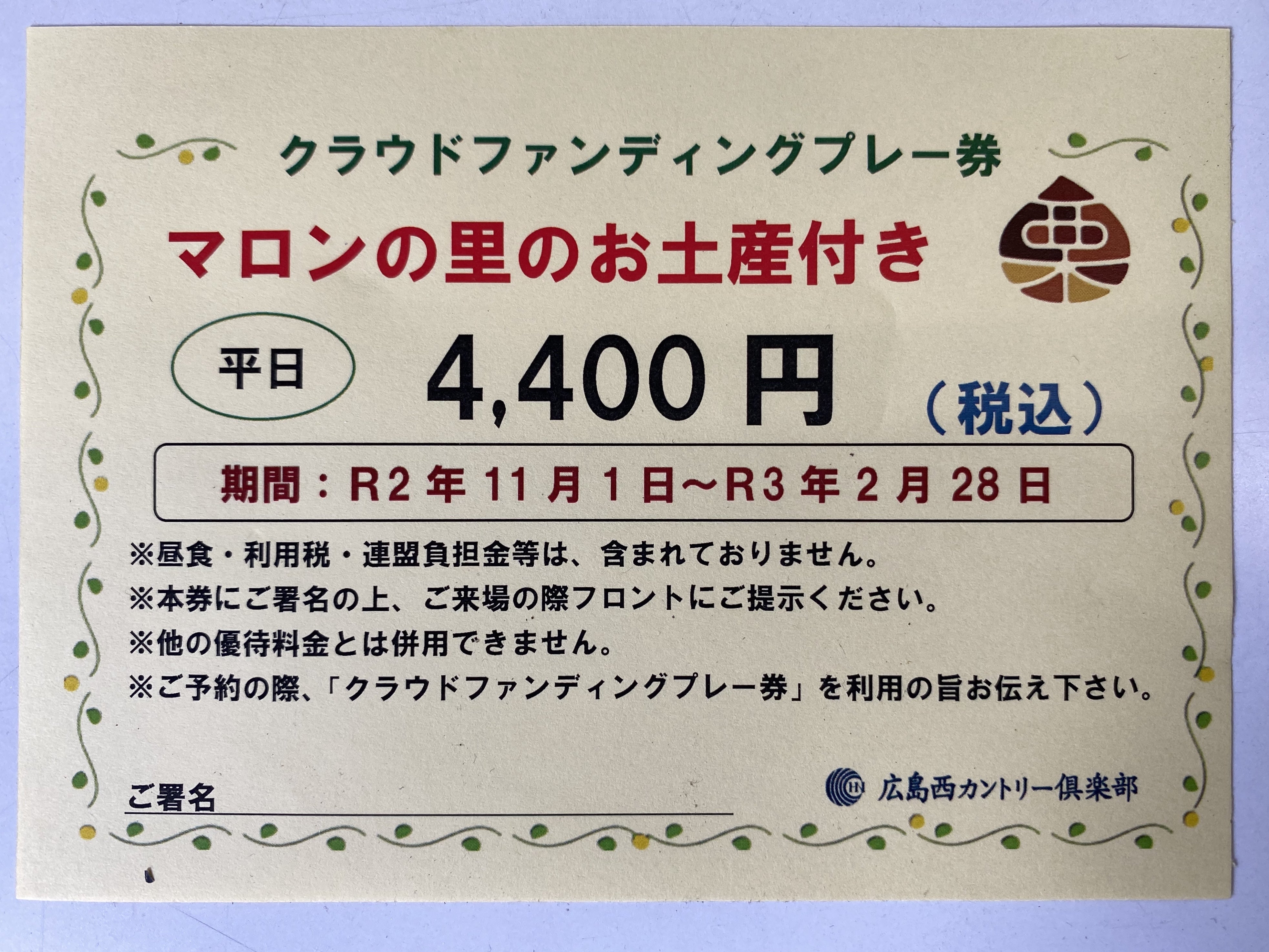 - ①4,400円プレーチケット(平日用)マロンの里お土産付き 通常8,470円→4,400円(消費税込)