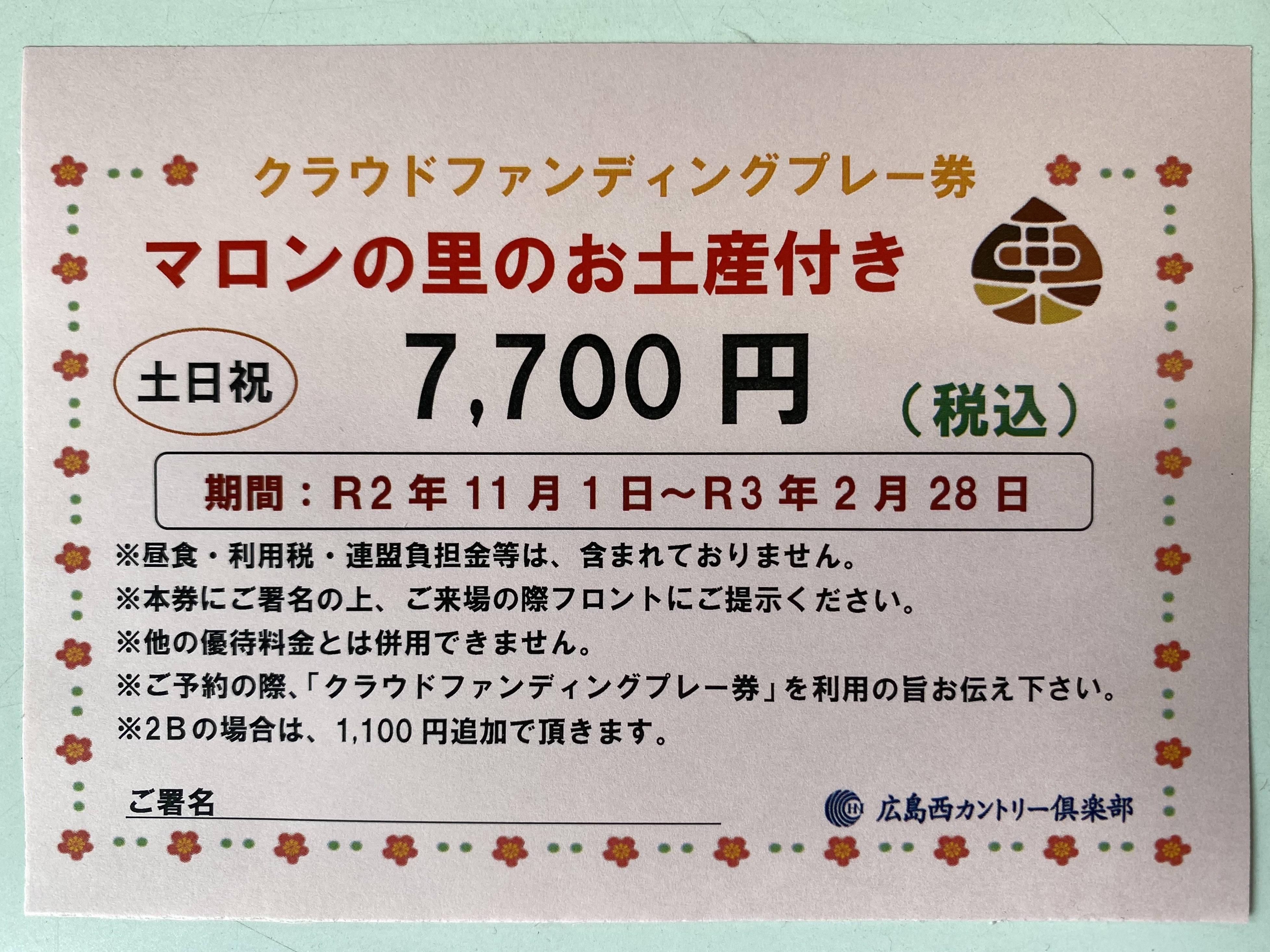 - ②7,700円プレーチケット(土日祝用)マロンの里お土産付き 通常12,595円→7,700円(消費税込)