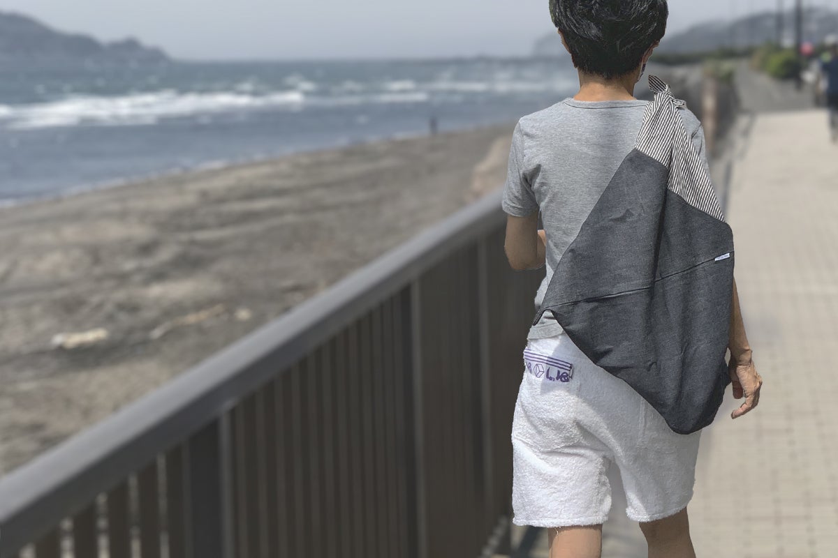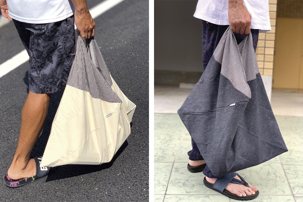 古くから「包む」道具として 日本で使われてきた風呂敷を、より便利に簡単にモノを持ち運べるよう改良してつくられた【 袋=バッグ 】です。