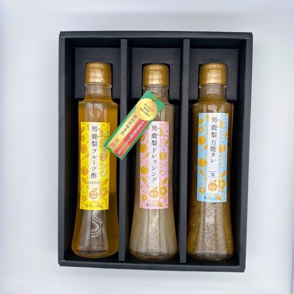 平成17年に結成された梨農家のグループで「梨で幸せになる」というコンセプトを元に規格外の梨を使用した商品を企画開発しています。自分たちが作った安心安全の美味しい梨を旬の時期だけでなく通年で味わってもらいたい。そんな想いから試作を重ね新しい商品を生み出してきました。現在は男鹿のスーパーや観光スポットでのみ販売され、商品の中には秋田県知事賞を受賞したものもあります。