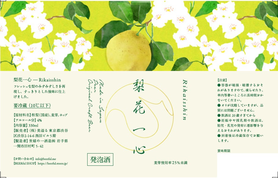 梨を主原料に作っているので、麦芽由来のプリン体は少なく、健康志向の方にもおすすめです。またアルコール度数は4%で10ヶ月間の熟成をさせたことで、果物特有の甘さが抜け、食事に合うようなすっきりと柔らかい味わいに仕上がりました。食中酒としてお楽しみいただけます。