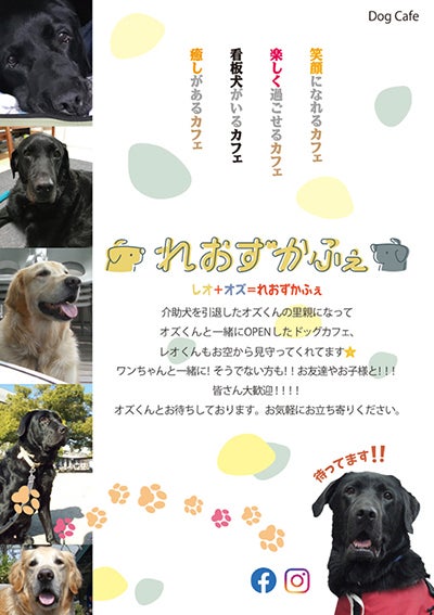 介助犬を引退したオズを引き取り、誰もが元介助犬と触れ合うことができる「れおずかふぇ」を2019年9月に兵庫県西宮市にオープンしました。カフェは、オズの出身である兵庫介助犬協会と同じ建物の1階にあり、すぐ近くには「えべっさん」で有名な西宮神社もあります。