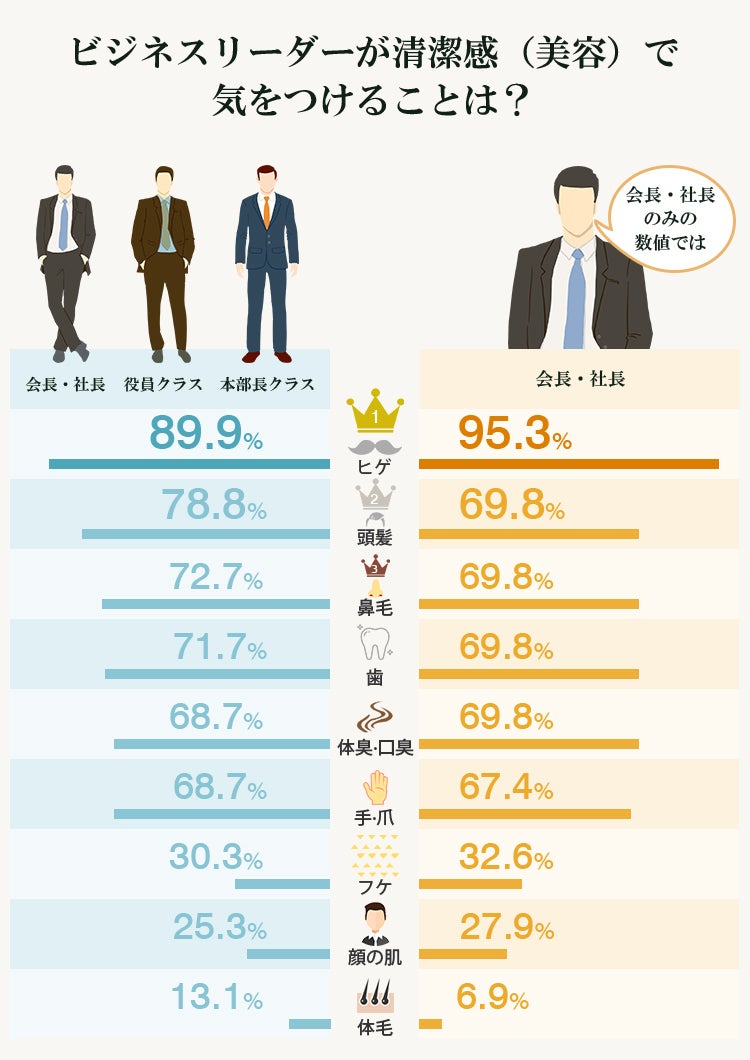 「清潔感」をキーワードにした調査では、男の清潔感といえばまずはヒゲという結果になりました。(続いて髪型、鼻毛、歯、体臭、爪、肌...)