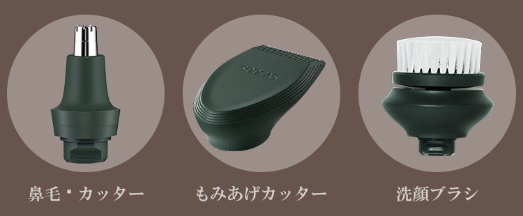 1台4役の「SOOCAS S5」は、先端に取り付ける多彩なアタッチメントがセットになっています。洗顔、もみあげカッター、鼻毛カッターなど用途に合わせてすぐに取り換えが可能です。