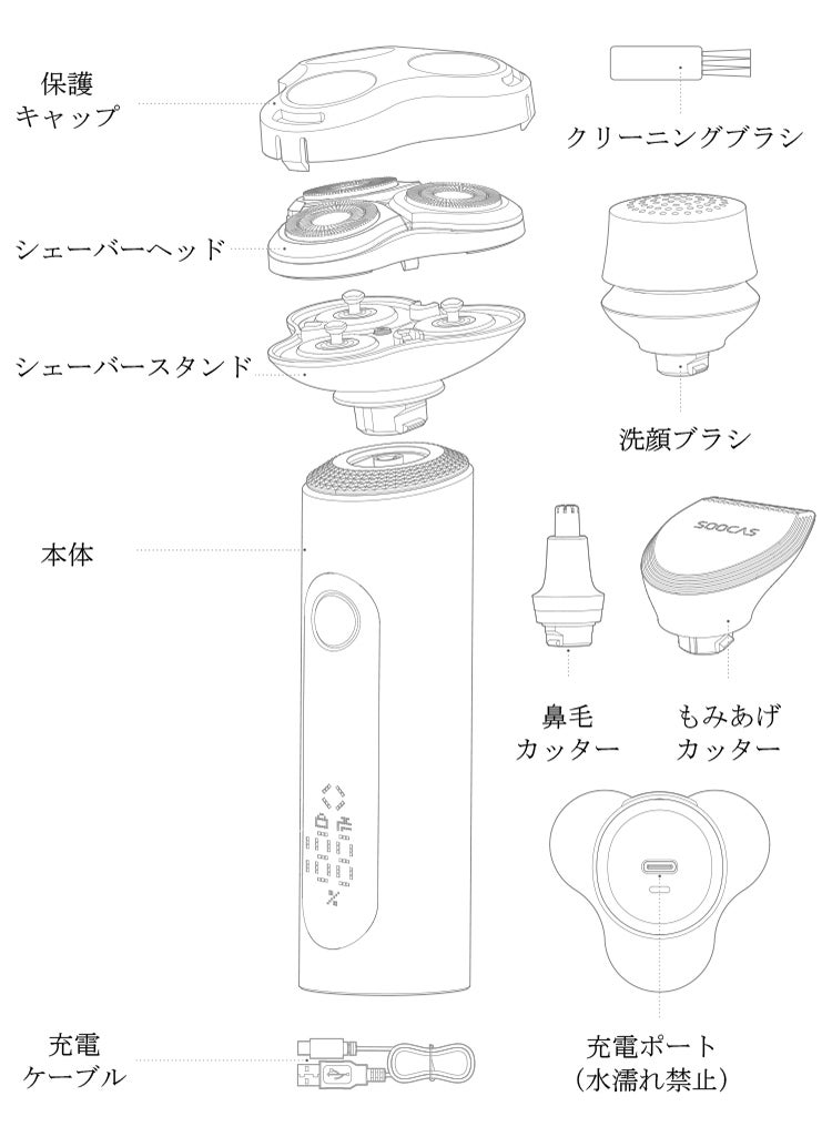 「SOOCAS S5」はひげそり、洗顔、鼻毛カット、もみあげカットの出来る1台4役の充実機能を搭載。これさえあれば旅行や出張用の時にも便利で、 洗面所にいろいろなグッズを揃える必要もなくスッキリとシンプルにまとまります。