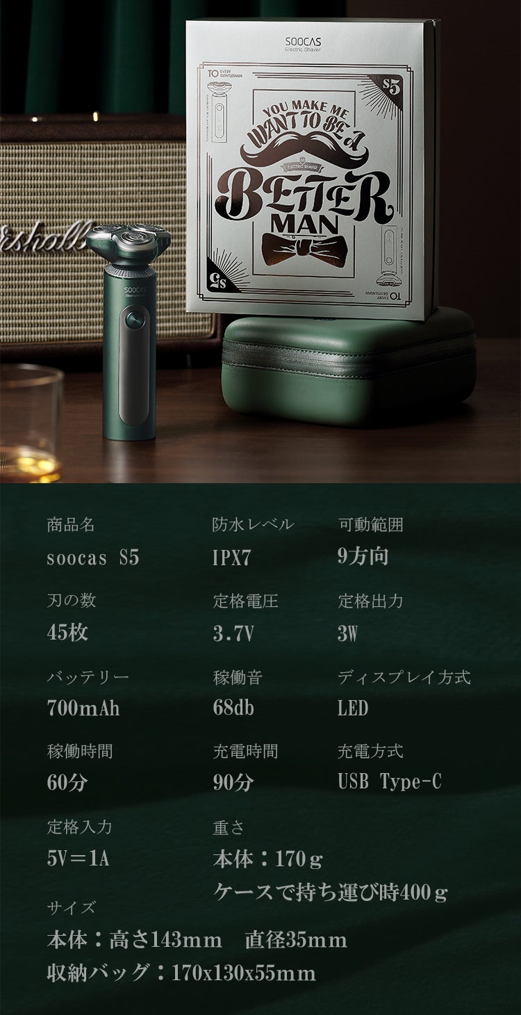 「SOOCAS S5」はIPX7の防水レベルです。シェービングフォームを使ったり、水洗いができ、ドライでもウェットでもお好みに合わせてお使い頂けます。