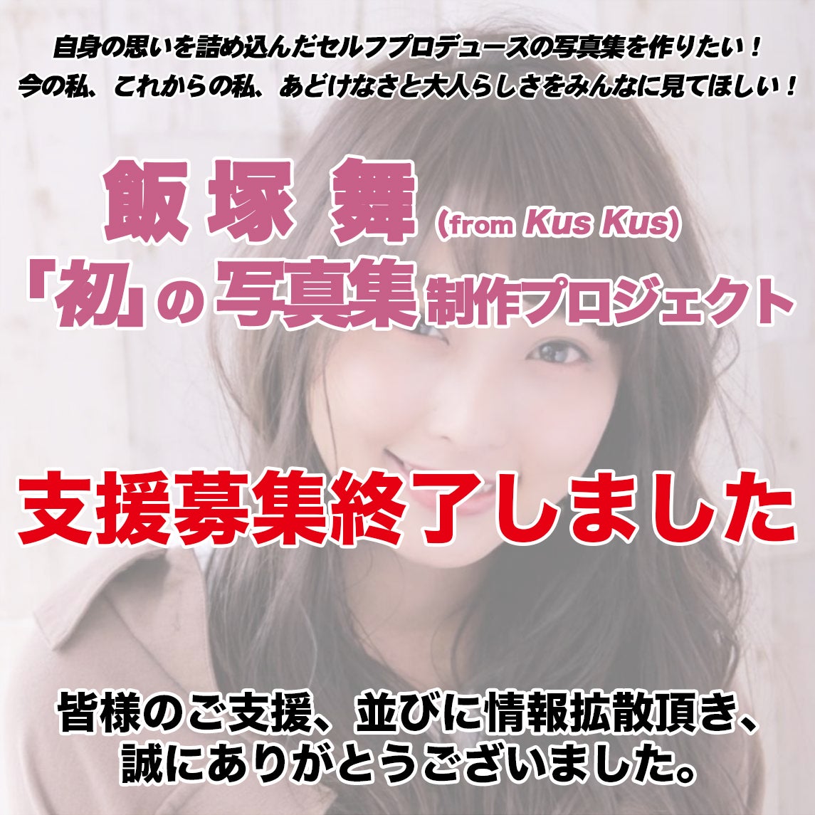 2020/12/15 20:41【リターン商品「写真集」他、発送完了、並びにプロジェクト終了のお知らせ】いつも Kus Kus、並びに飯塚舞 を応援頂き、誠にありがとうございます。本日、全支援者様への発送完了いたしましたので、ご報告させていただきます。※離島にお住まいのお客様は配送期間の兼合いにより、未着の場合ございます。お手元に届くまで、今しばらくお待ちくださいませ。すでにご覧になっているお客様より、今回の写真集への思いやご感想を各種SNSにて沢山頂戴しており、大変感激しております。重ねて御礼を申し上げます。これからも皆様が思わず“クスクス”笑顔になるような、そんな音楽、製品等をお届けできるよう努めてまいります。改めて、ご支援いただきまして誠にありがとうございました。今後ともご愛顧を賜りますよう、何卒よろしくお願い申し上げます。 もっと見る各リターン商品発送日のご案内