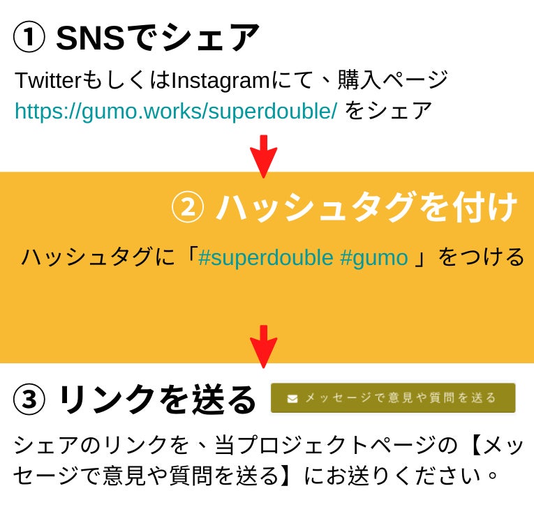 ① TwitterもしくはInstagramにて、購入ページ(https://gumo.works/superdouble/)を投稿。