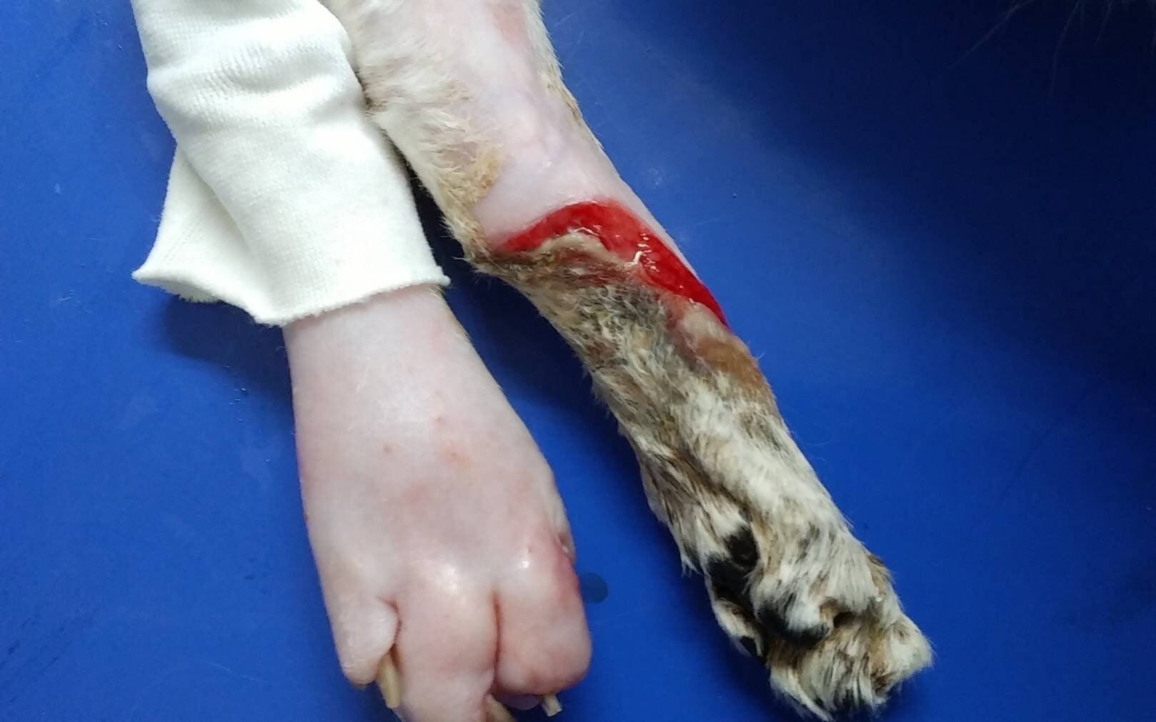 現在まるちゃんは、再発や感染の危険と戦いながら、連日の治療のため病院で生活しています。両後肢は麻痺が残っていますが、 骨を覆うようにかなりの皮膚が再生され、厚く包帯を巻いてもらった足で歩くことができるようになりました。