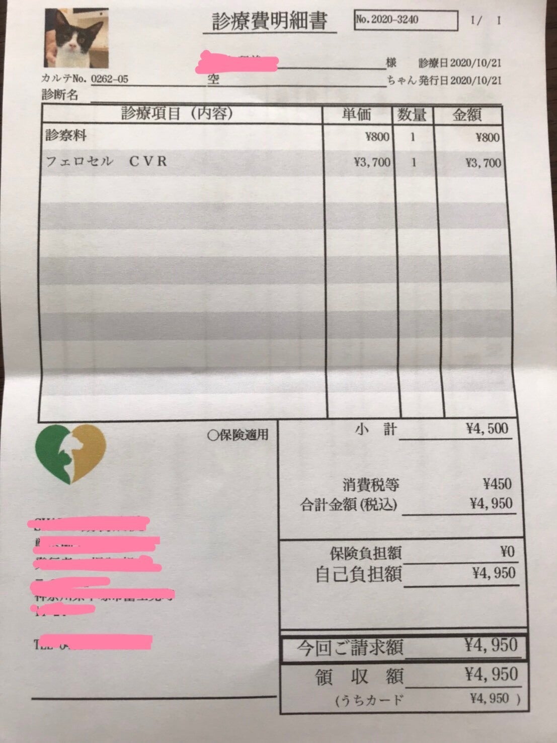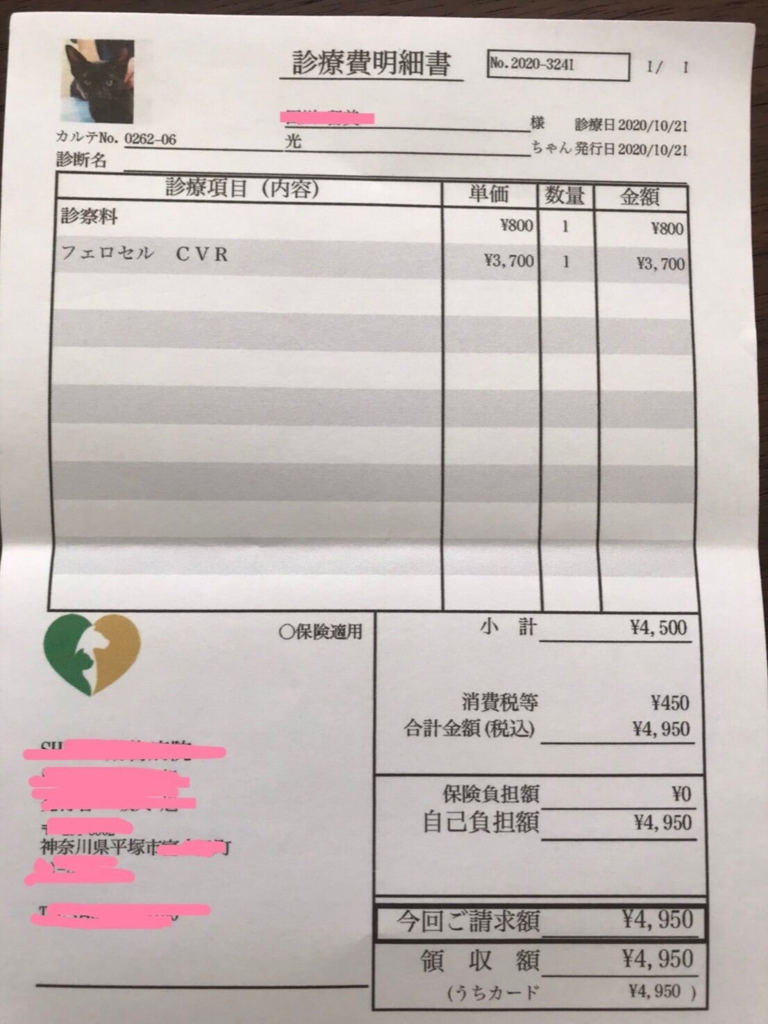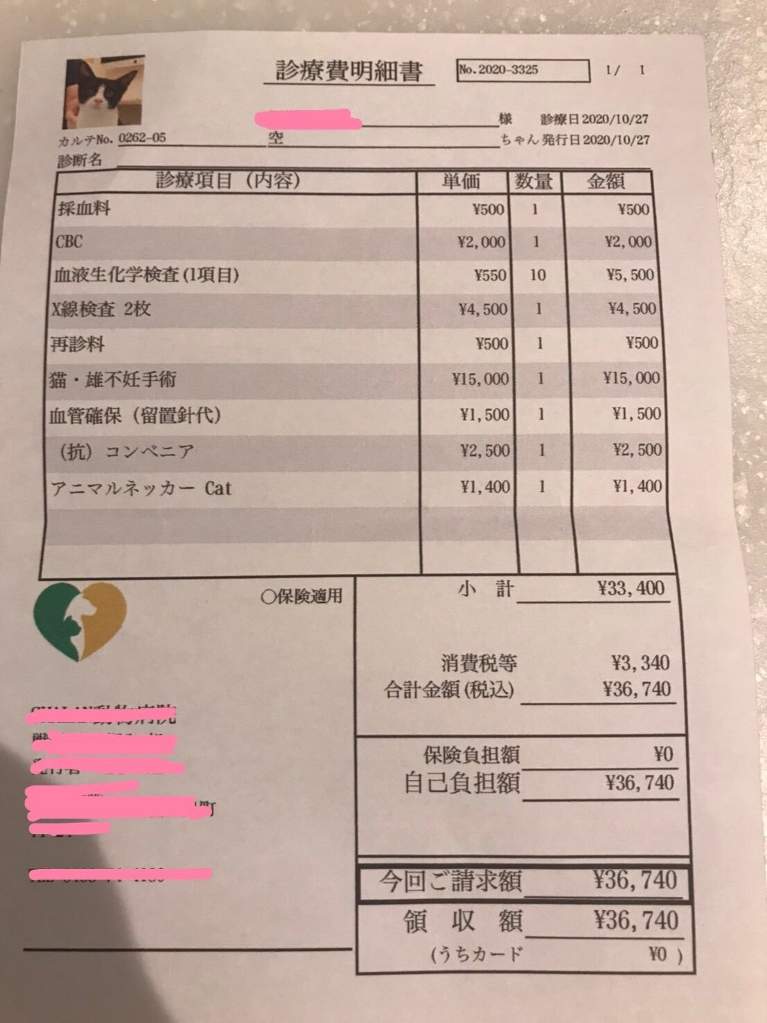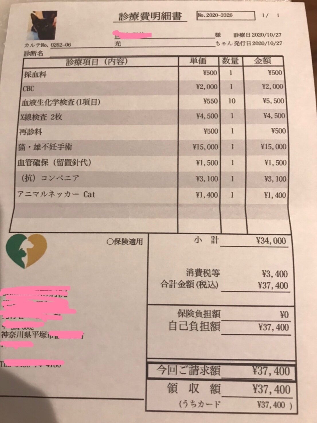 飼い猫としての手間をかけ、普通の料金で手術をしました。