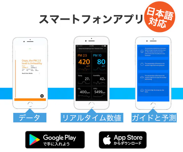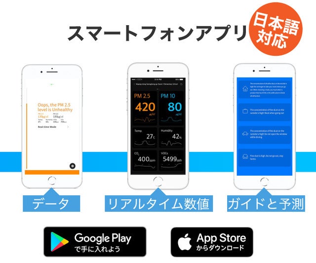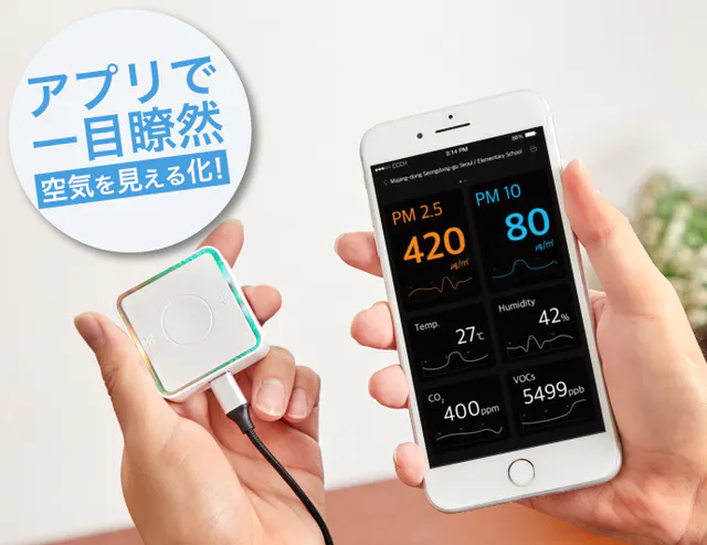 A.アプリをダウンロードし、SNSアカウントもしくはメールアドレスで登録をした後、本体の電源を入れ、Bluetoothで接続すれば周りの空気をモニターします。