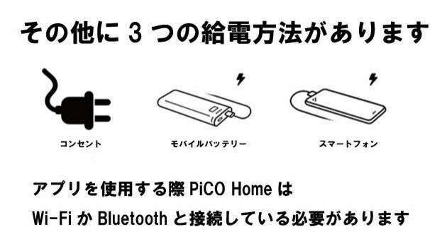 PiCO Homeは主に家庭での使用を想定しています。(USBケーブル、電源アダプター付属)。