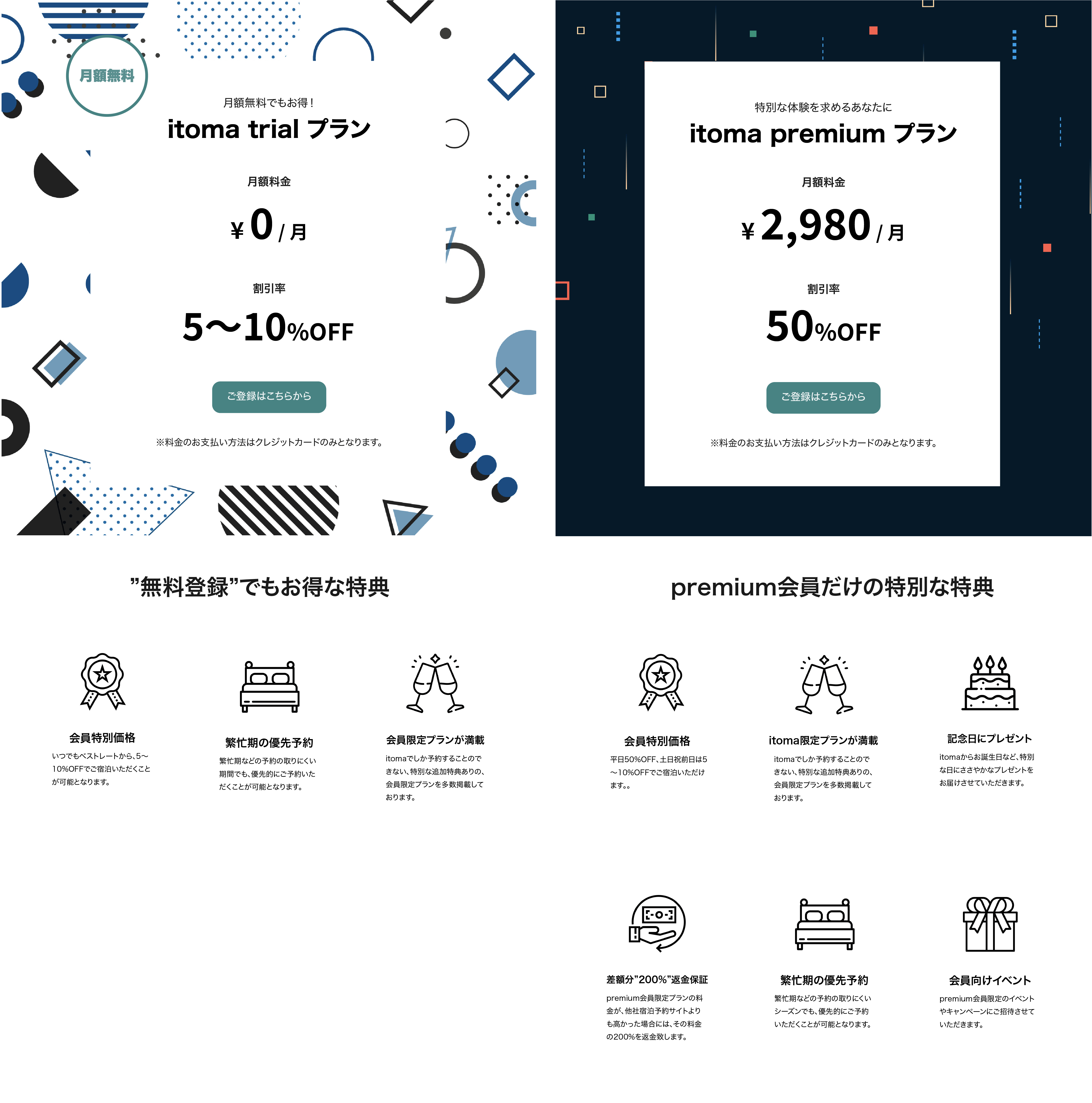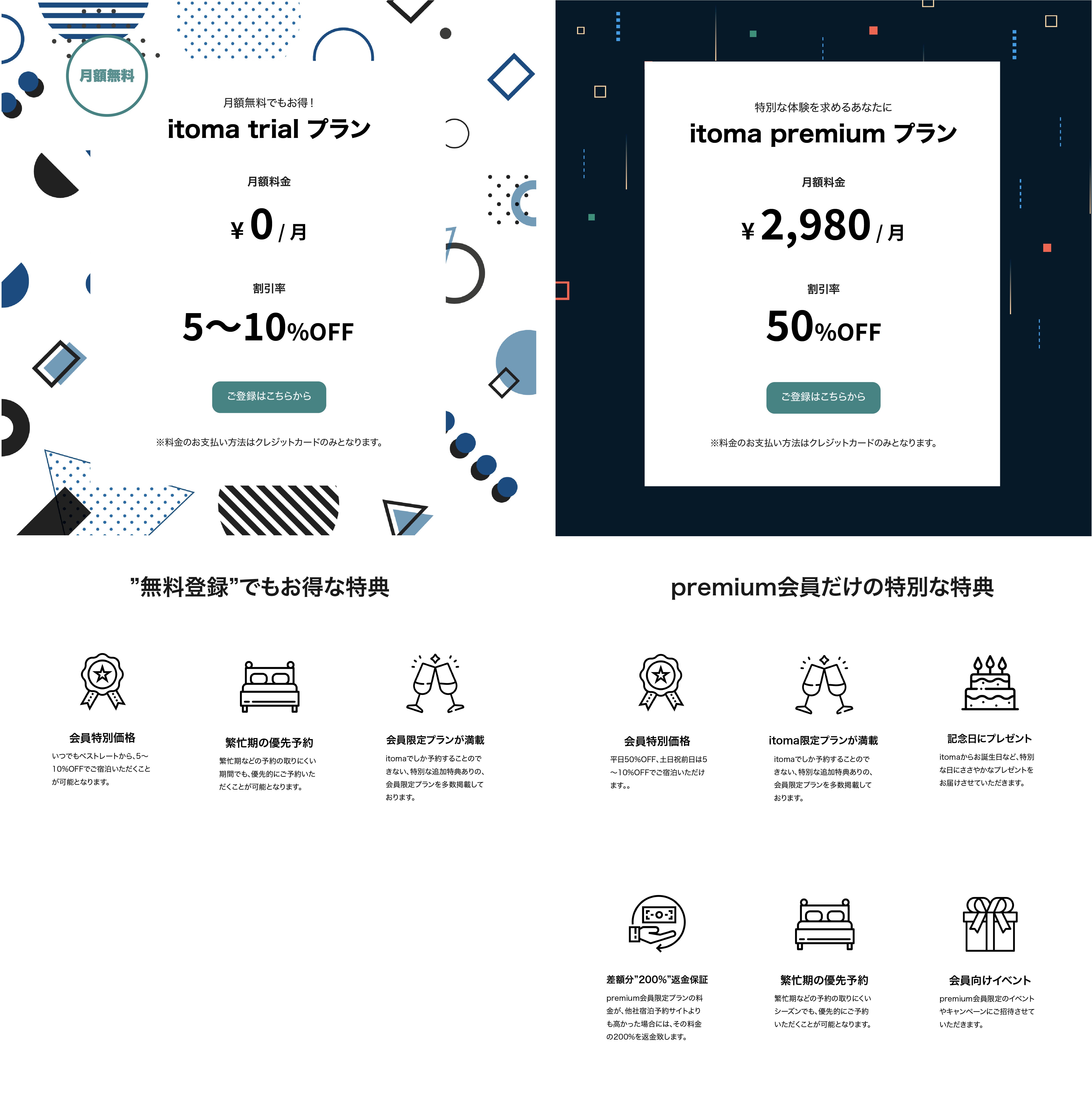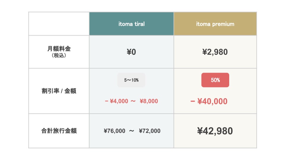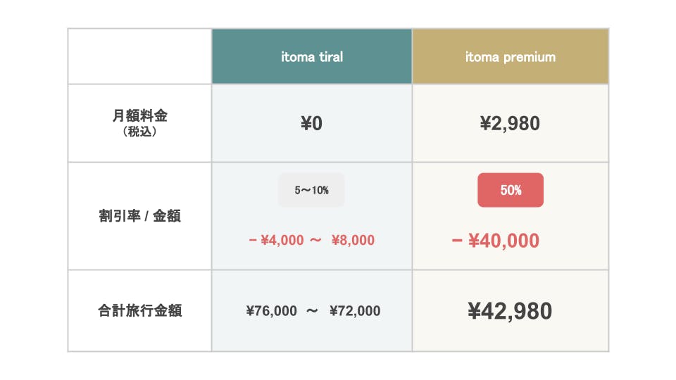 premium会員なら、平日のご旅行が50%オフになり、さらにitomaからの記念日特典が付きます。