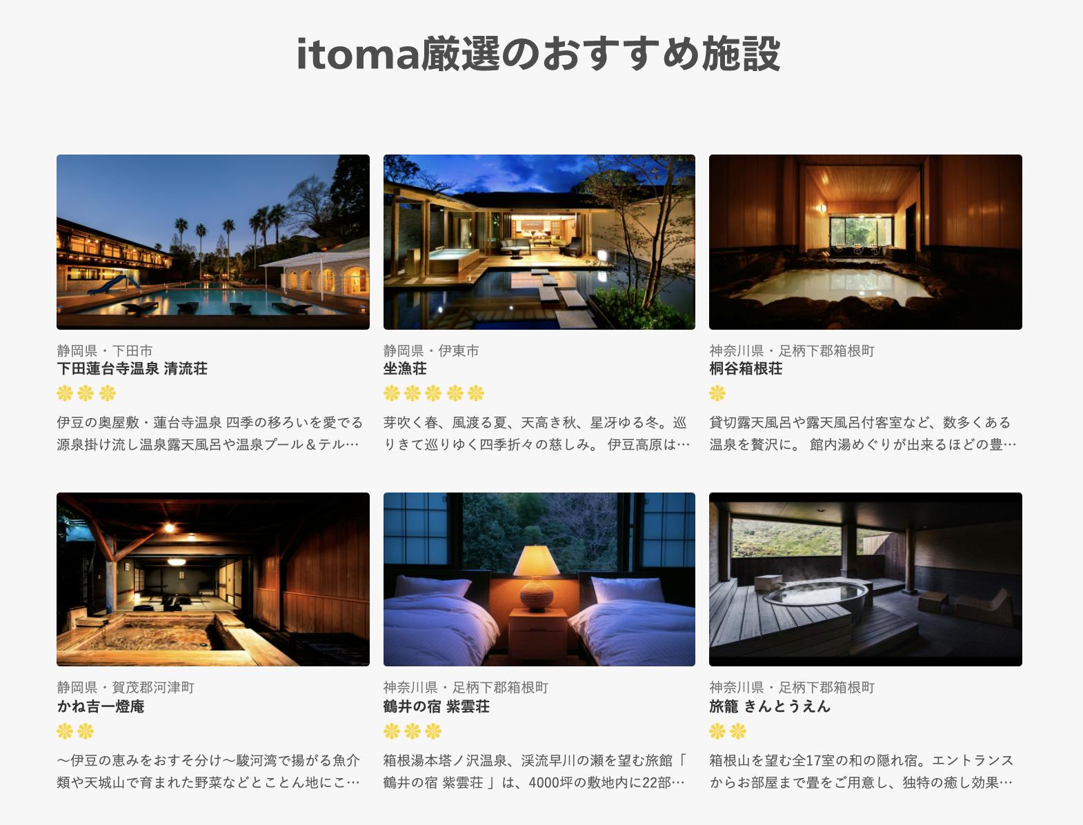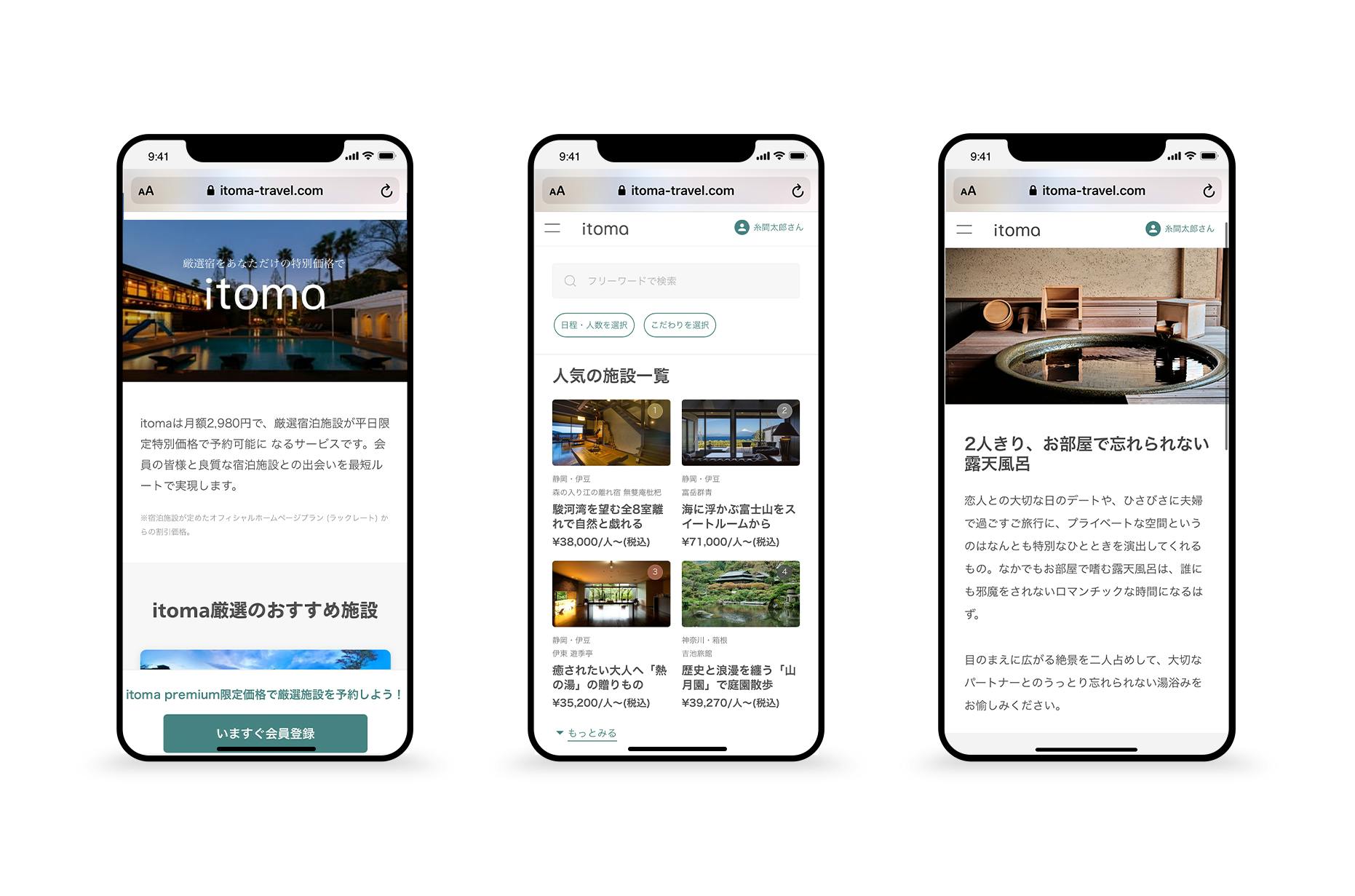 itomaにご掲載頂いている旅館は、プライベート空間を大切大事にしている厳選されたの宿泊施設です。会員様だけが味わえる、贅沢な時間をあなただけの特別価格で提供するとともに、旅行好きなユーザが旅行をすればそれがそのまま旅館文化を守ることにつながるサービスです。