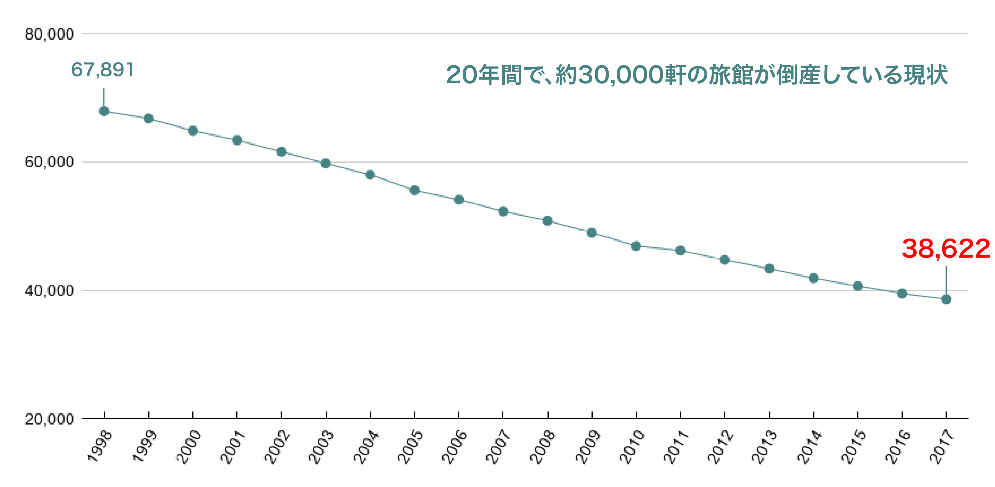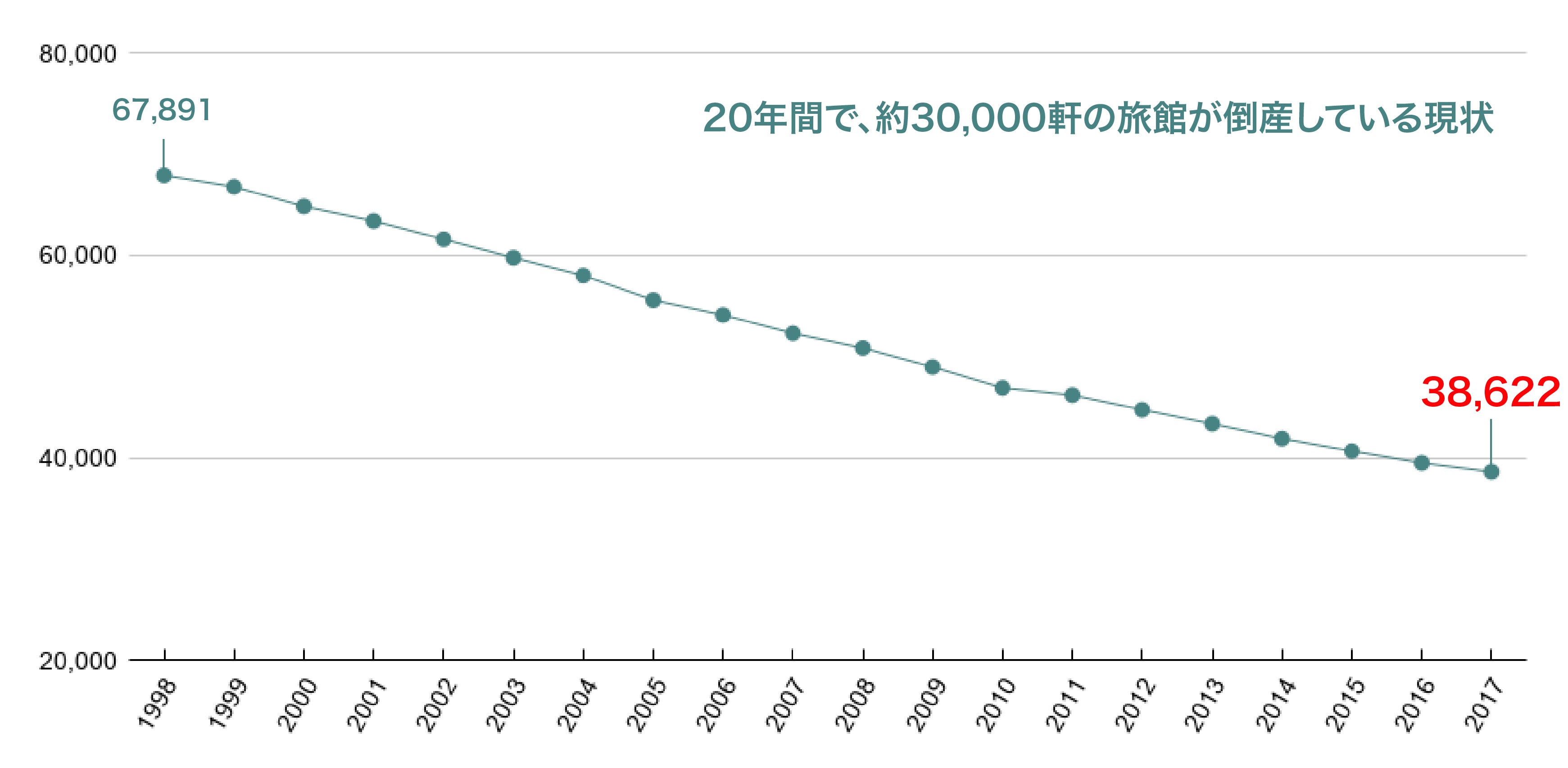 1998年には、67,891軒あった旅館は、2017年には、38,622軒になっています。