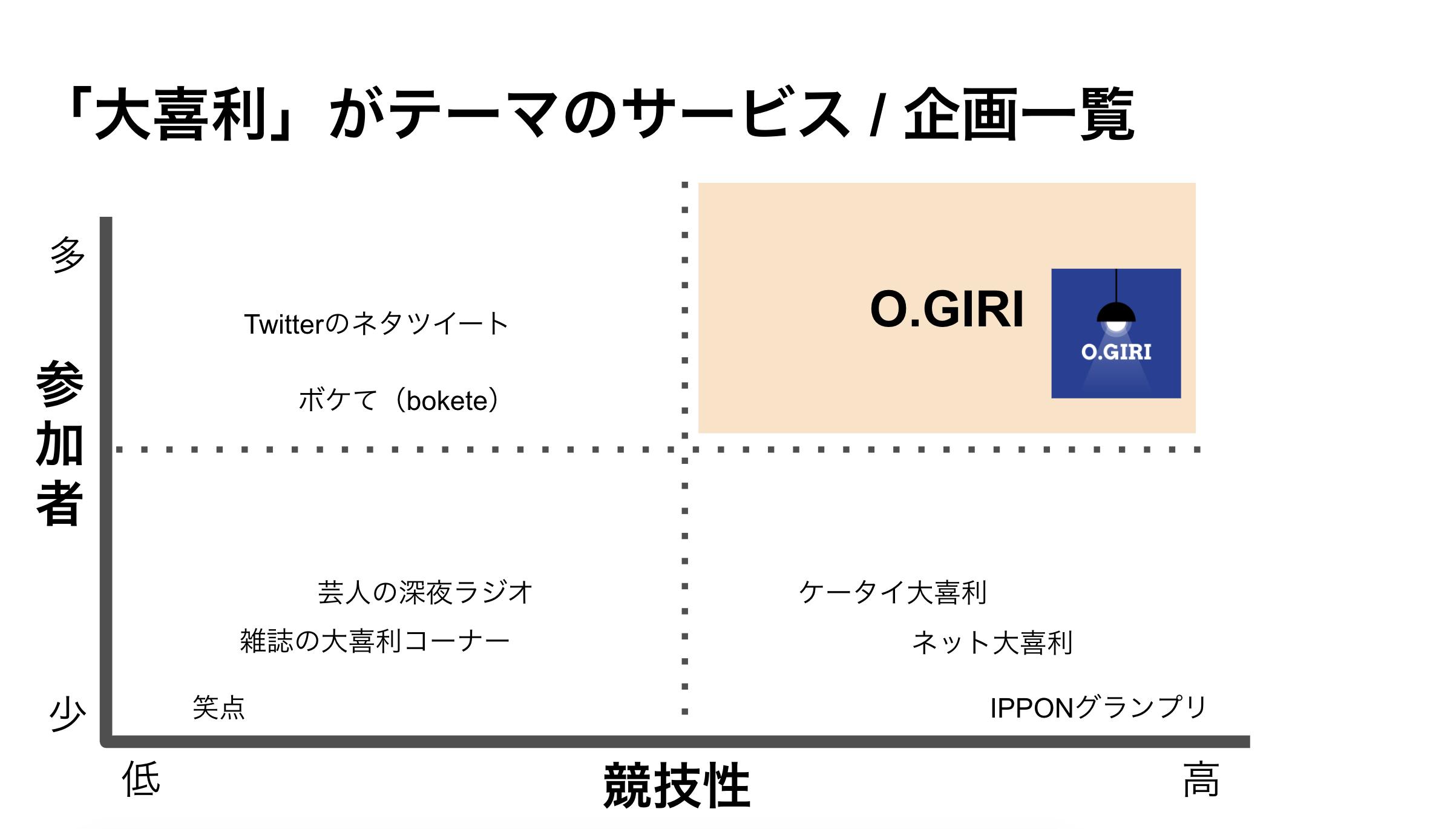 スマホで気軽に大喜利が楽しめる「O.GIRI」。これまでに有りそうでなかった「競技性の高い大喜利スマホアプリ」の運用を目指しています。現在鋭意開発中。リリースは9〜10月頃を予定しておりますので、今こうしている間にも、ひょっとすると既にリリースがされているかもしれません。