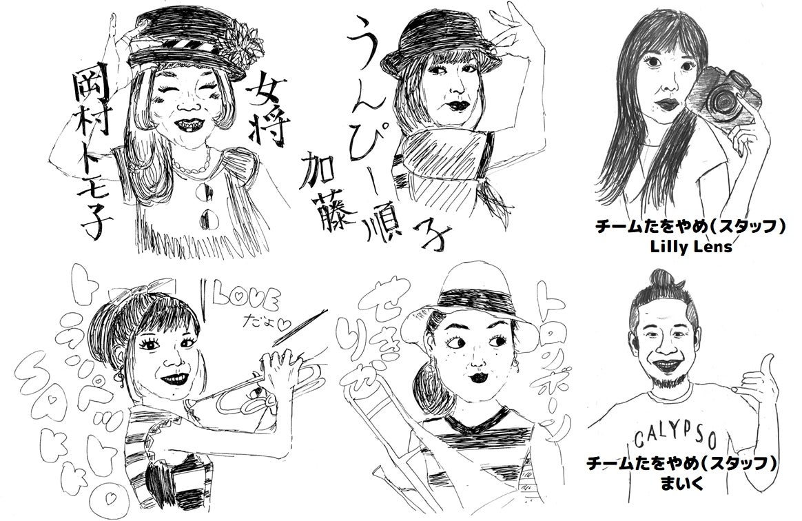 このクラウドファンディングを司る6名です。クラウドファンディングは達成してからが本番!!この6人を筆頭に【チームたをやめ】総勢19人(メンバー16人+チームスタッフ3人)でプロジェクトを進めてまいります。どうぞよろしくお願いします。女将・岡村トモ子イラスト by 沼尾木綿香(T.sax)