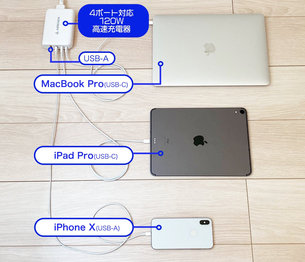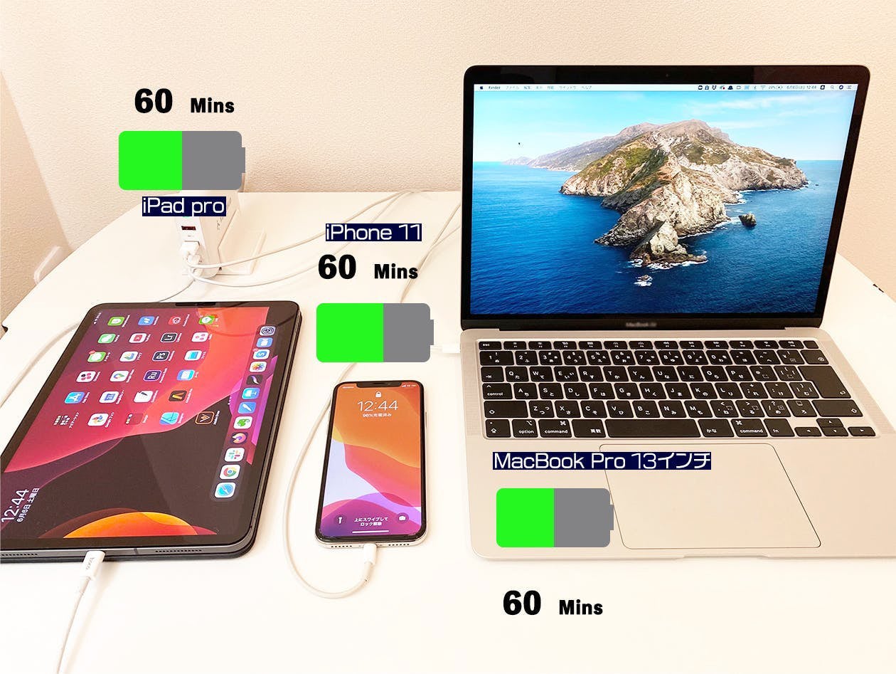例えばiPhone11なら30分かからずに50%以上の充電ができ、MacBook Proなどの必要電力が高い機器も高速に充電ができます。
