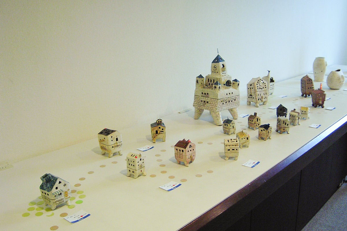 「歩くいえ」「歩く城」等の~歩くシリーズ~。POTTER華苗の代表作であり、ライフワークの一つとなっています。(写真は広島福屋八丁堀本店7階ギャラリー101)