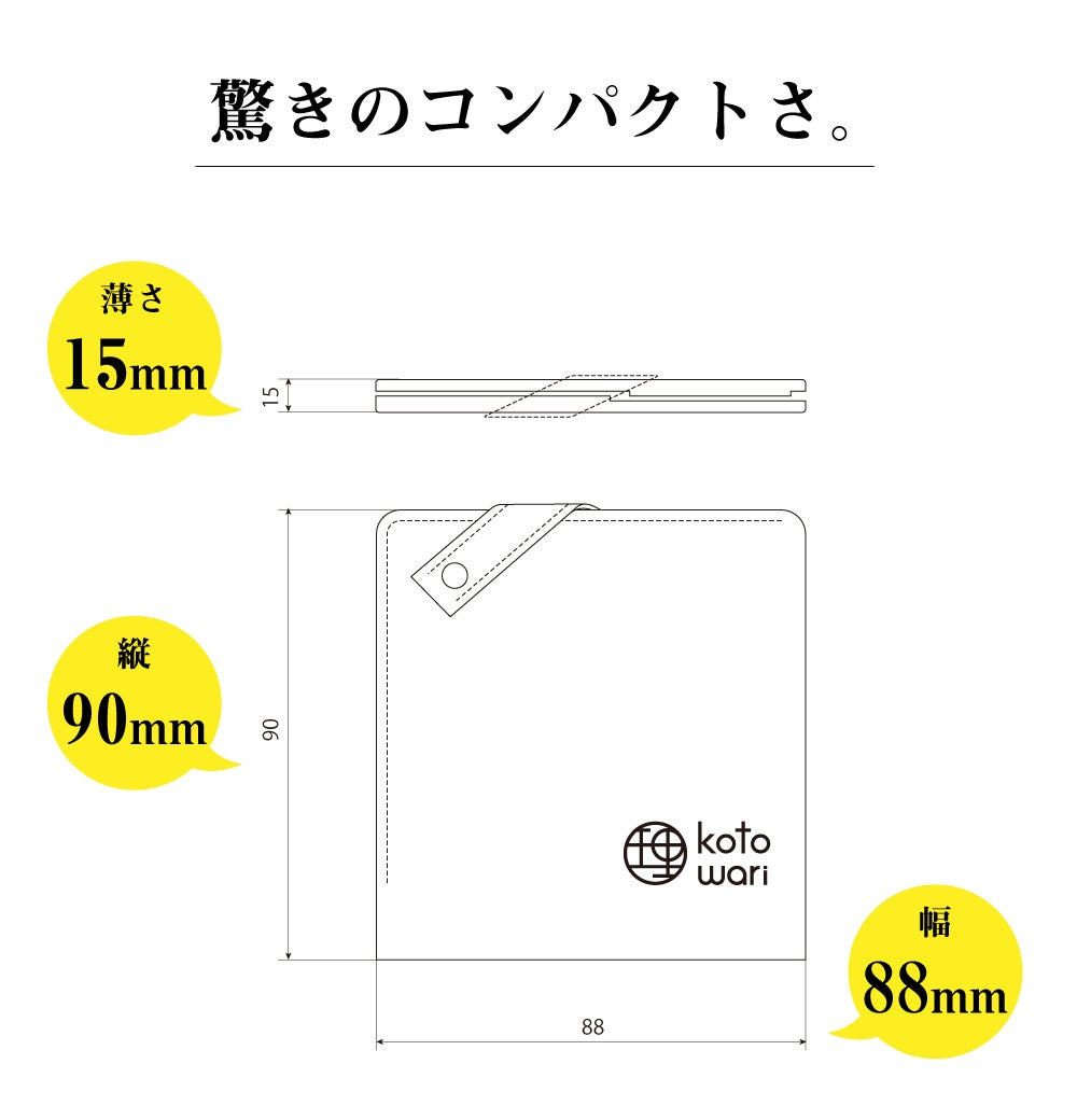 【理 kotowari® mini】は、実用時におおよそ『薄さ15mm・縦90mm × 横88mm』と驚きのコンパクトさ。